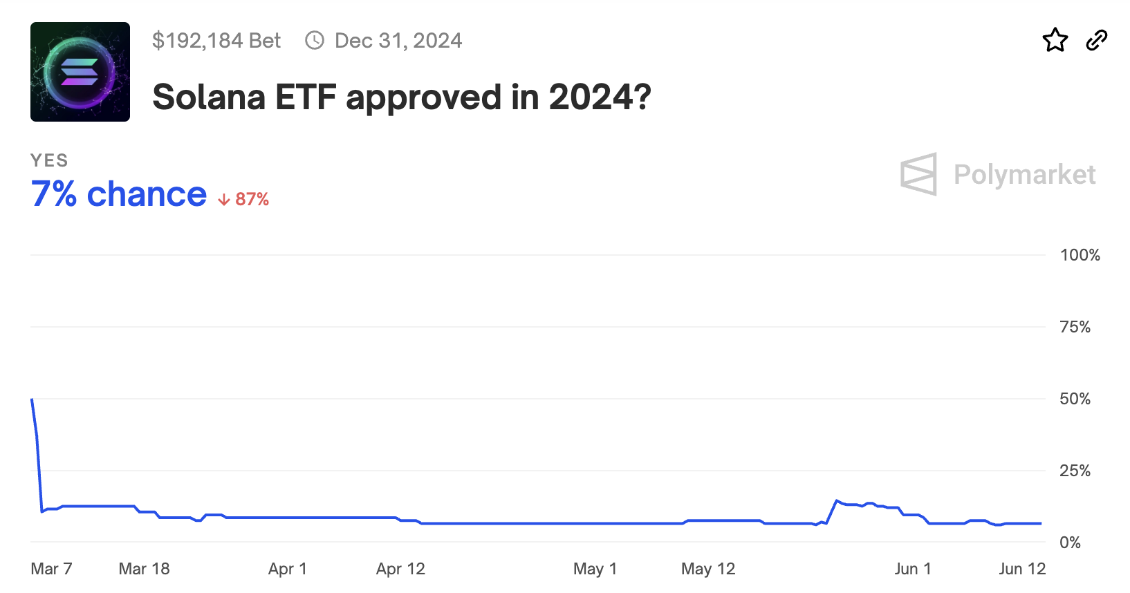 Während Marktanalysten genau hinsehen, bleibt das Potenzial für einen ETF ein Diskussionsthema. Dennoch berichtet das Prognoseportal Polymarket eine 7-prozentige Chance auf eine Genehmigung eines Solana Spot ETF im Jahr 2024. Der Wetteinsatz von etwas mehr als 192,000 USD deutet darauf hin, dass das Angebot für Spekulanten noch nicht attraktiv ist.
