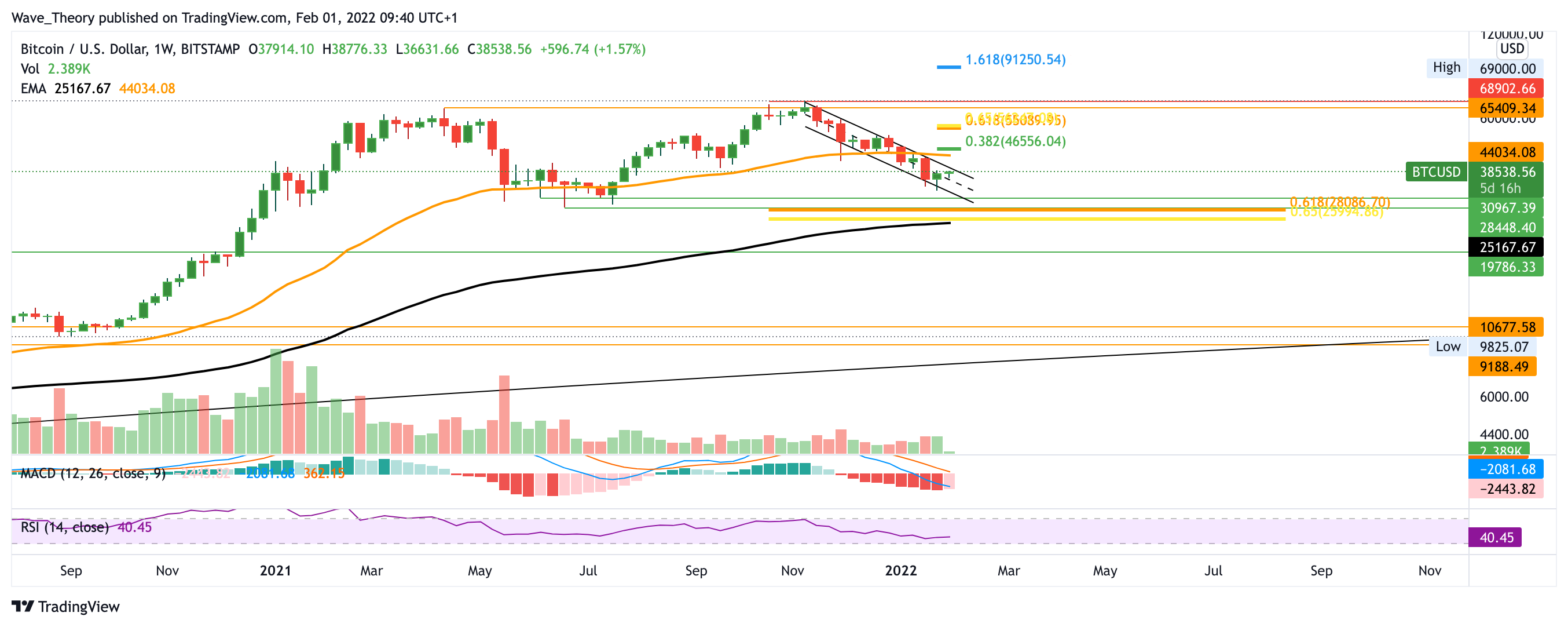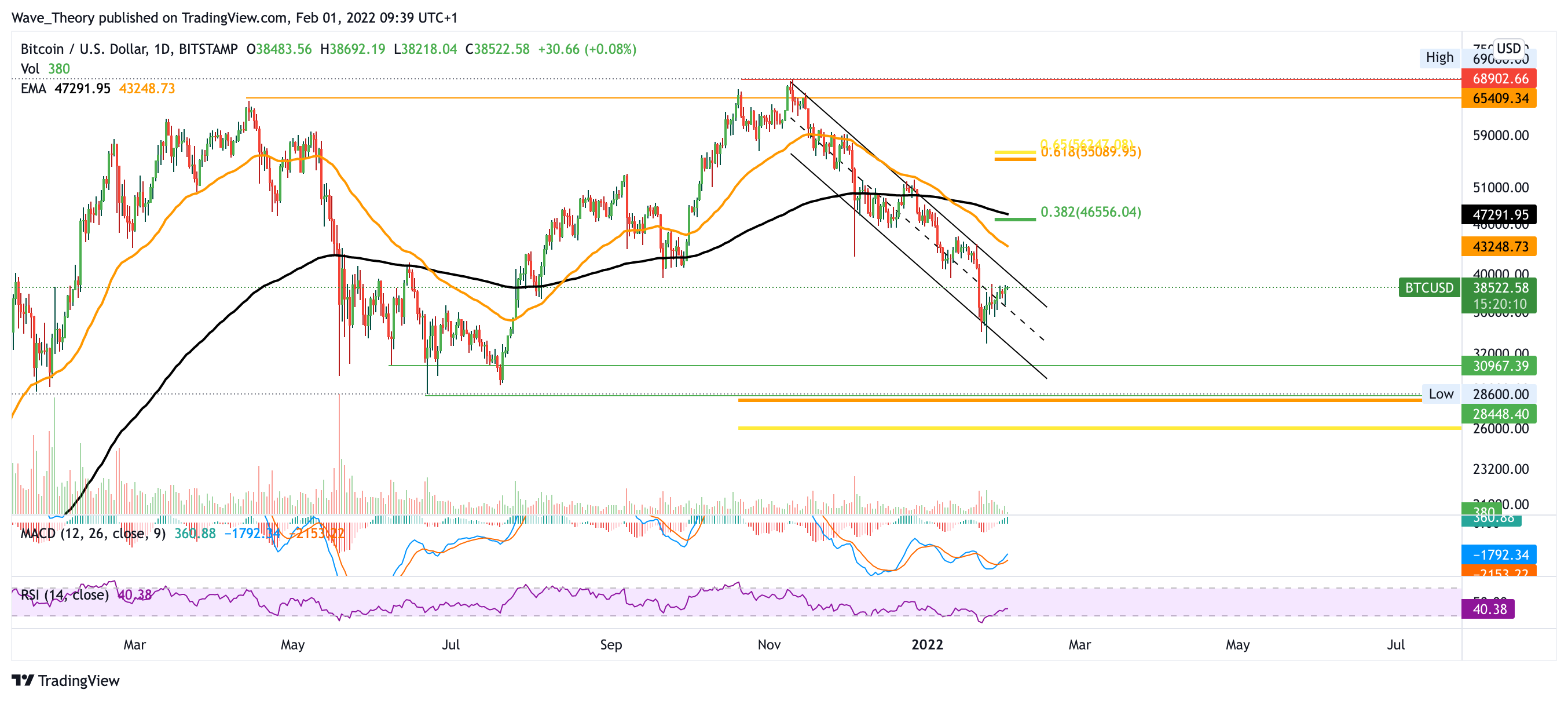 Der Bitcoin Kurs befindet sich in einem parallelen Abwärtskanal, der den Bitcoin Kurs zur Golden Ratio Unterstützung knapp unterhalb der 30.000 USD Marke bringen könnte. Dort stößt der BTC Kurs auf massive Unterstützung. Sollte der BTC Kurs jetzt jedoch aus dem bärischen Abwärtskanal ausbrechen, stößt BTC spätestens bei rund 44.000 USD auf Widerstand. Im Tageskurs zeigt sich der MACD eher bullisch: die MACD Linien sind bullisch überkreuzt und das Histogramm tickt bullisch höher.
