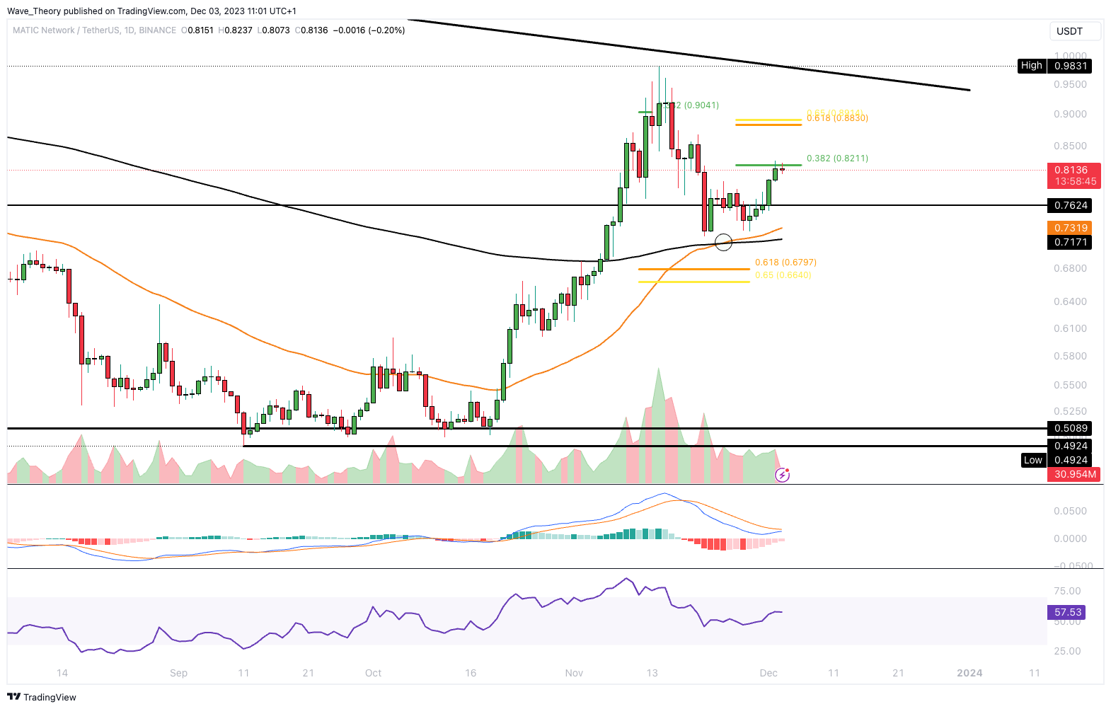 Der MATIC Kurs konnte in den letzten fünf Tagen kräftig ansteigen. Damit befindet sich Polygon jetzt am 0,382 Fib Widerstand bei rund 0,821 USD.