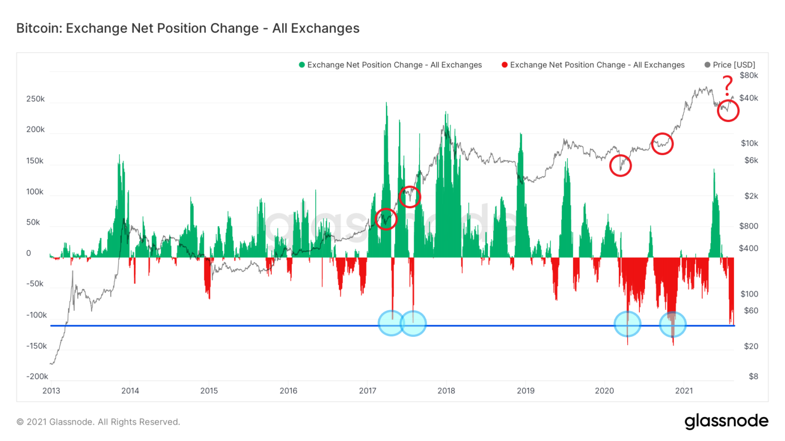 Der On-Chain-Analyst Will Clemente twitterte am 18. August 2021 über den Indikator. 111033 BTC sind laut dem Tweet in den letzten drei Tagen von den Exchanges abgehoben worden. Er bezeichnete den Rückgang als einer der größten Drops der Exchange-Bestände in der gesamten Geschichte des Bitcoins. In der Vergangenheit gab es bis jetzt nur vier solche Situation. Diese sind unten blau eingezeichnet. Zweimal war die Menge der abgehobenen BTC kleiner (2017). Zweimal war die Menge größer (2020).