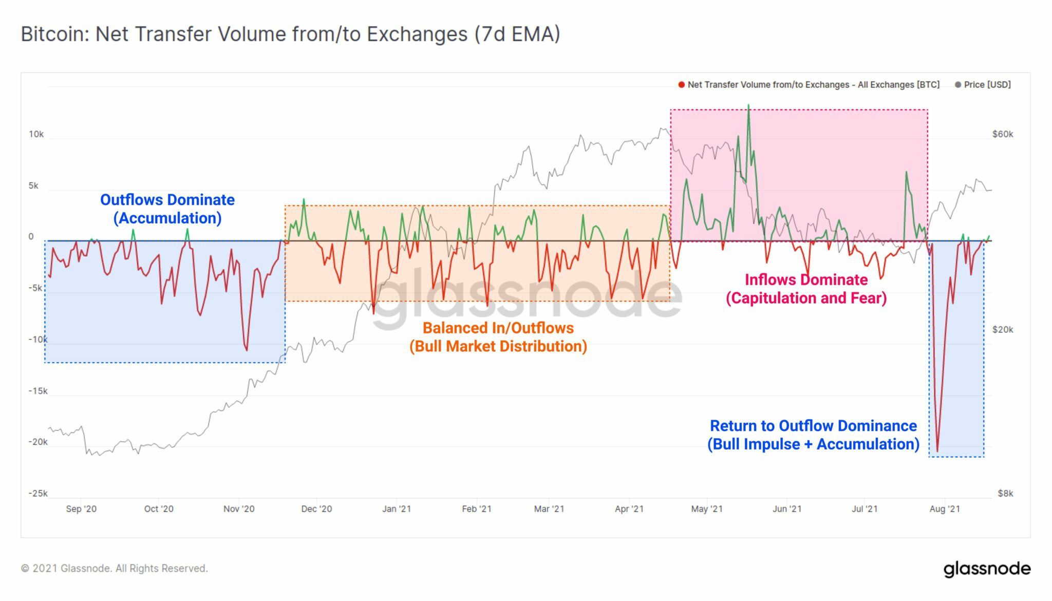 Bei dem nächsten Chart von Glassnode kannst du den 7-Tages-EMA des Netto-Transaktionsvolumens sehen. Er zeigt dir die entsprechende Differenz der BTC, die auf Exchanges eingezahlt und ausgezahlt wurden, an. Der Chart zeigt uns, dass sich der BTC-Markt wohl wieder in einem bullischen Verlauf befindet und die letzte Akkumulierungsphase vorbei ist.
