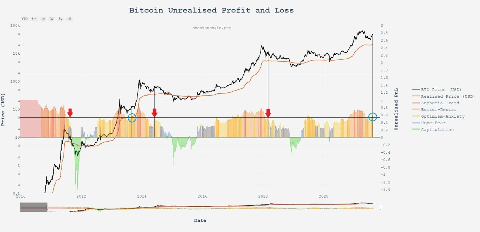 Der Analyst Charles Edwards postete einen interessanten Chart des gleichen Indikators. Allerdings hat er eine andere Skalierung und Balken anstatt einer durchgehenden Linie verwendet. Er hat die Punkte, an denen der NUPL unter 0.5 gefallen ist, und ein Bärenmarkt begonnen hat, mit den roten Pfeilen markiert. Al der NUPL über 0.5 angestiegen ist (die blauen Kreise) gab es danach einen Kursanstieg 2013 und bis jetzt. Wir werden sehen, ob der Bitcoin Preis bald weiter ansteigen wird.