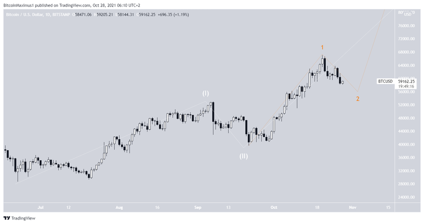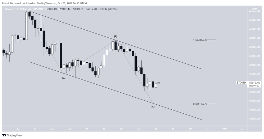 Dies ist der letzte Abschnitt des Abwärtstrends, nachdem der BTC Kurs wahrscheinlich seine vorherige Aufwärtsbewegung wieder aufnehmen wird. Darüber hinaus ist es möglich, dass die Bewegung in einem absteigenden parallelen Kanal verläuft. Dies deutet darauf hin, dass der Bitcoin Preis in Richtung 56.550 USD fällt, da dieser Bereich mit der Unterstützungslinie des Kanals zusammenfällt. Außerdem würde dies ein Verhältnis der Wellen A:C von 1:1 ergeben, was bei solchen Korrekturen üblich ist.