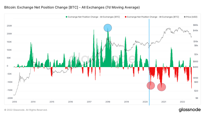 Seit Anfang 2020 ist jedoch eine allmähliche Umkehr der Dominanz und eine Zunahme der Bitcoin-Abhebungen an den Kryptobörsen zu sehen. Die letzten beiden Zeiträume mit den höchsten BTC-Abflüssen waren April 2020 – direkt nach dem COVID-19-Crash – und November 2020 – der Beginn des vorherigen Bullenmarktes (rote Kreise). Die Bitcoin-Abflüsse in diesen Zeiträumen erreichten die 7D-SMA-Tiefststände bei -115.000 BTC und -127.000 BTC.