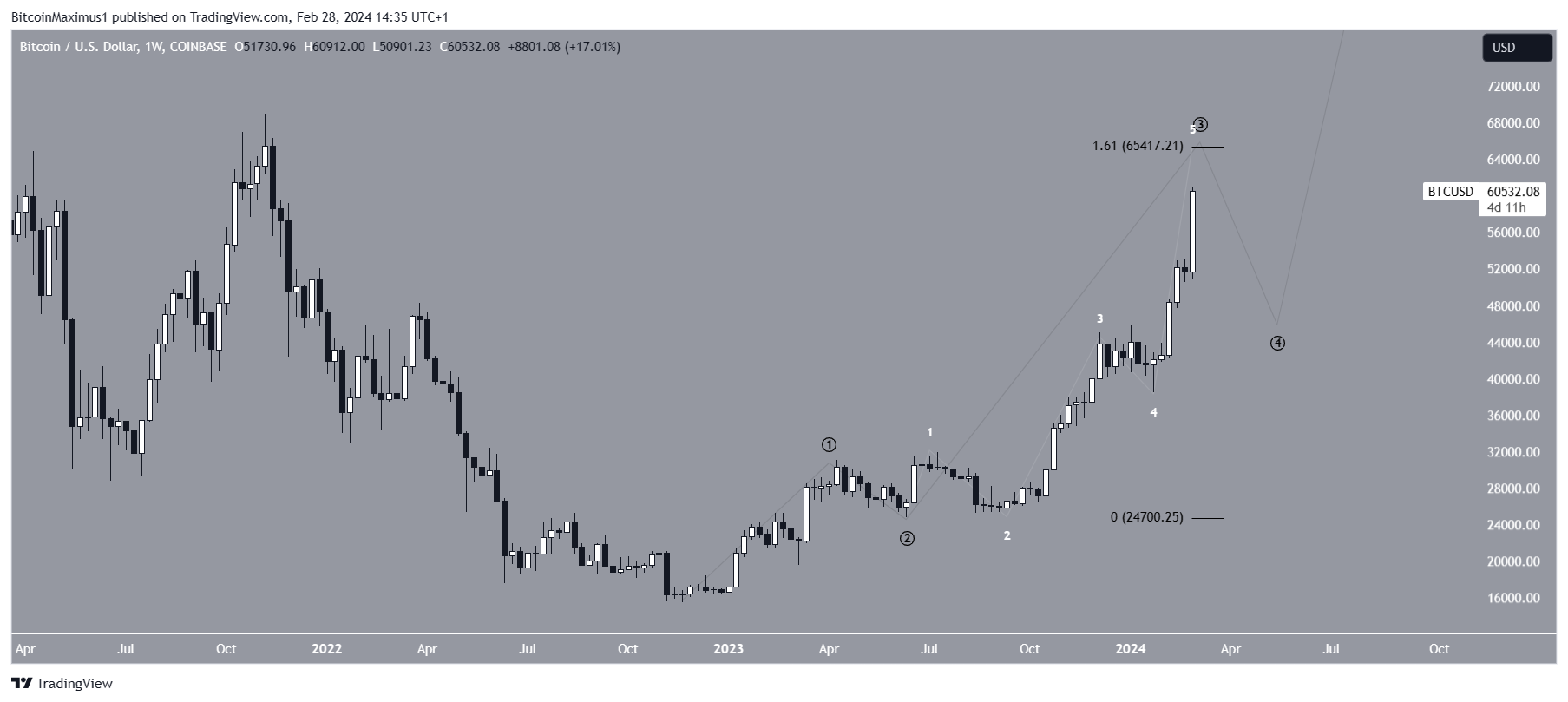 Die Analyse der Wellenbewegungen zeigt, dass der Bitcoin-Wert sich in der dritten Welle (schwarz) eines fünfwelligen Aufwärtstrends befindet. Die Unterwellen sind in Weiß markiert. Bisher war die dritte Welle länger als die erste und nähert sich dem 1,61-fachen Wert bei 65.400 USD. Dies könnte ein passendes Niveau für ein kurzfristiges Hoch sein, welches den Beginn der vierten Welle signalisieren würde.