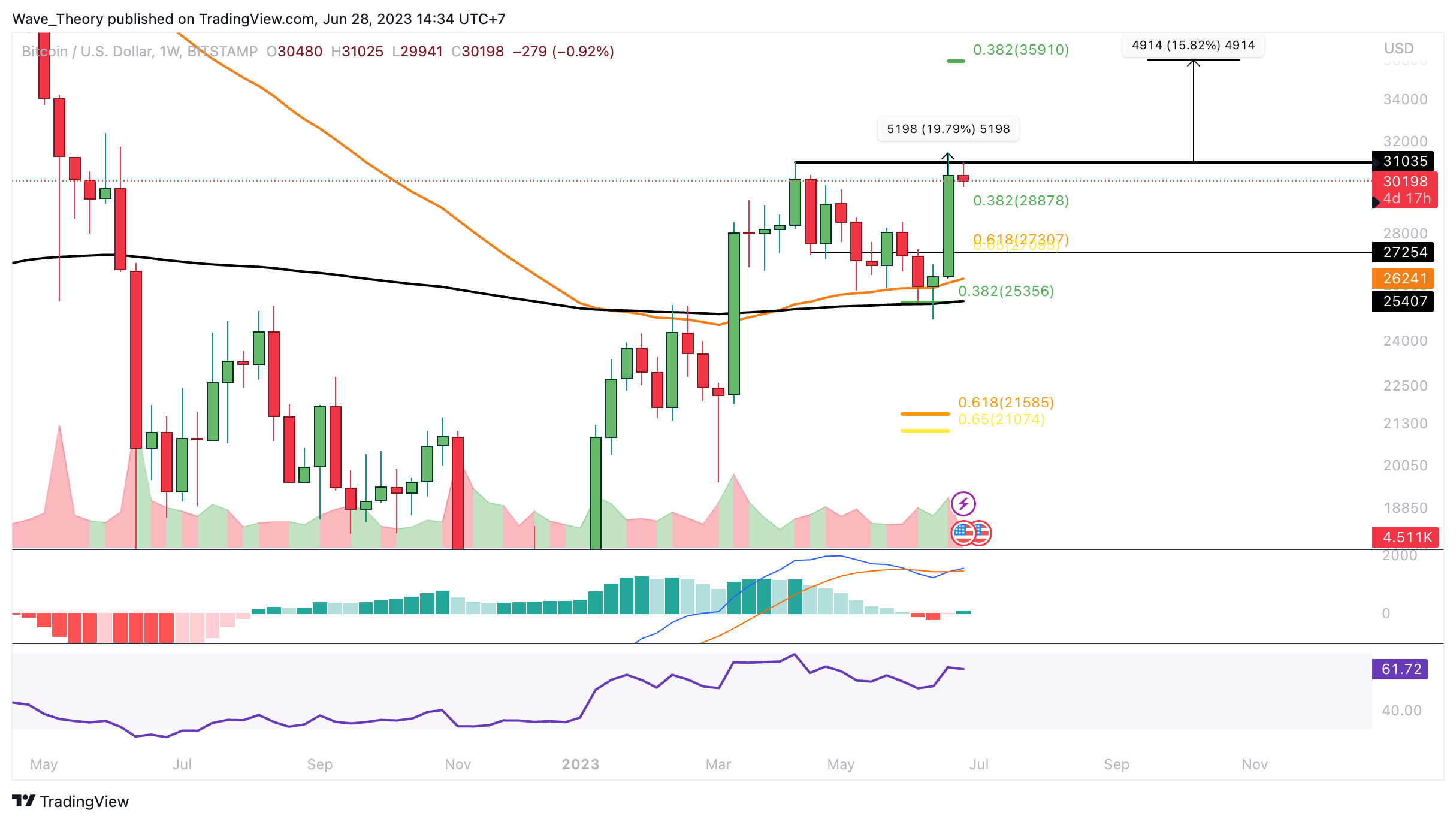 Im Monatschart tickt das Histogramm des MACDs nach wie vor bullisch höher, womit sich nun auch die MACD Linien bullisch überkreuzen könnten. Insgesamt ist es sehr bullisch zu bewerten, wie souverän sich BTC über dem 50-Monate-EMA am 0,382 Fib Niveau bei rund 25.000 USD gehalten hat.