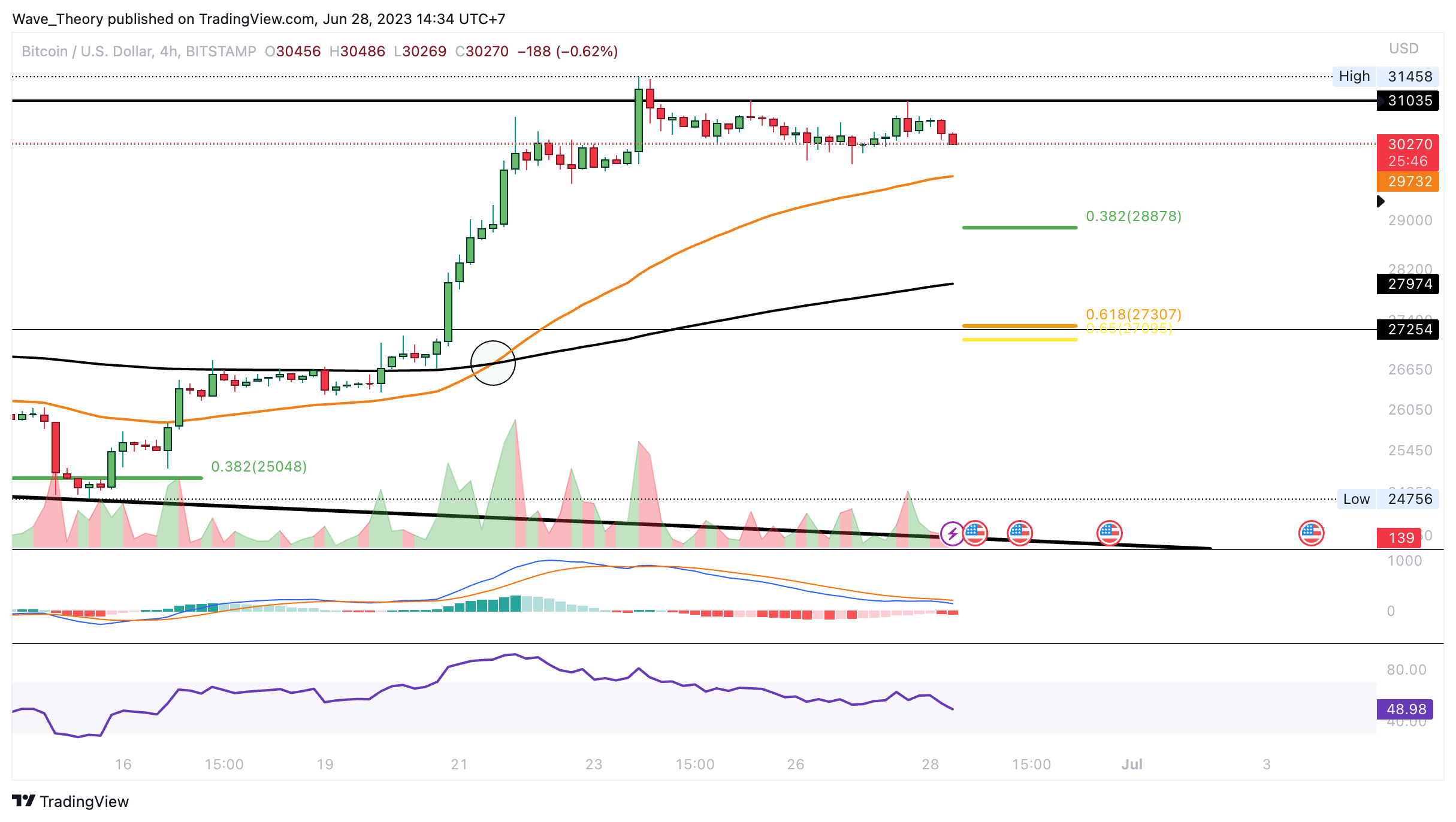 Schließlich stieß BTC am Preisniveau von rund 31.000 USD auf horizontalen Widerstand, woran BTC zunächst bärisch abgewiesen werden scheint.
