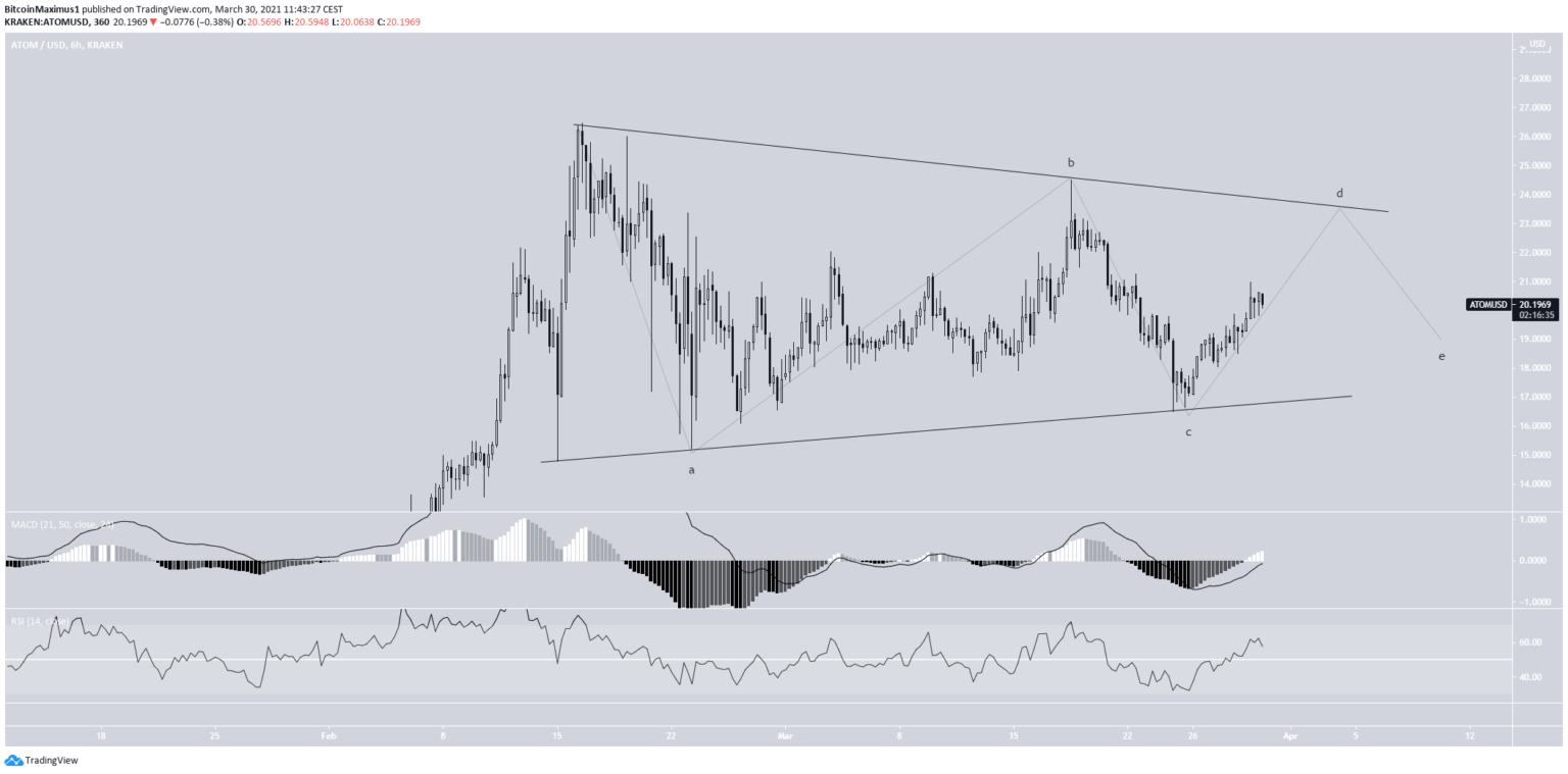 Der ATOM Preis wird seit dem 16. Februar 2021 innerhalb eines symmetrischen Dreiecksmusters gehandelt. Dieses Muster ist in der Regel weder als bullisch noch als bärisch zu betrachten. Da das Muster aber nach einer Aufwärtsbewegung aufgetreten ist, wird er wohl bald über die obere Linie des Dreiecks ausbrechen.