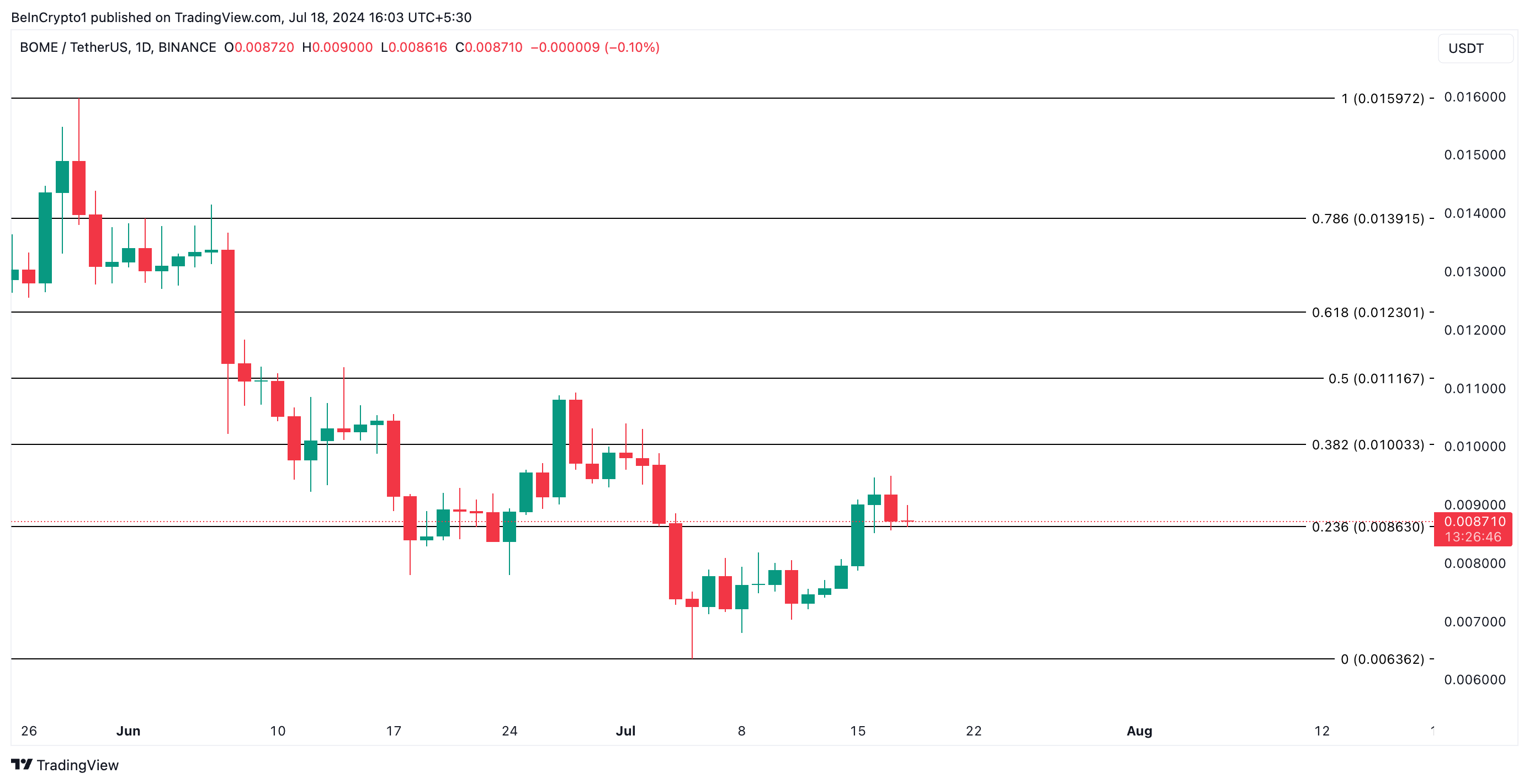 Wenn BOME seinen derzeitigen Aufwärtstrend beibehält, wird er über das Niveau von 0,01 USD hinaus ansteigen. Der Memecoin wurde zuletzt Anfang Juni über diesem Niveau gehandelt.