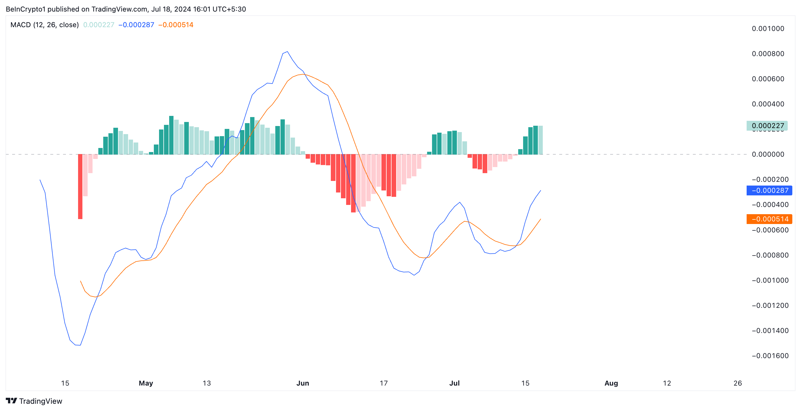 Ein weiterer bemerkenswerter Indikator, der die wachsende bullische Aktivität im BOME-Markt hervorhebt, ist seine Konvergenz/Divergenz der gleitenden Durchschnitte (MACD). Zum Zeitpunkt der Veröffentlichung liegt die MACD-Linie von BOME (blau) über der Signallinie (rot) und versucht, über die Nulllinie zu kreuzen.