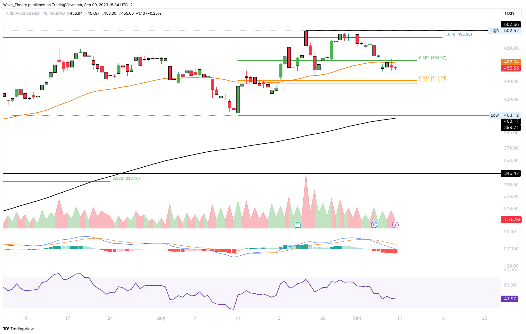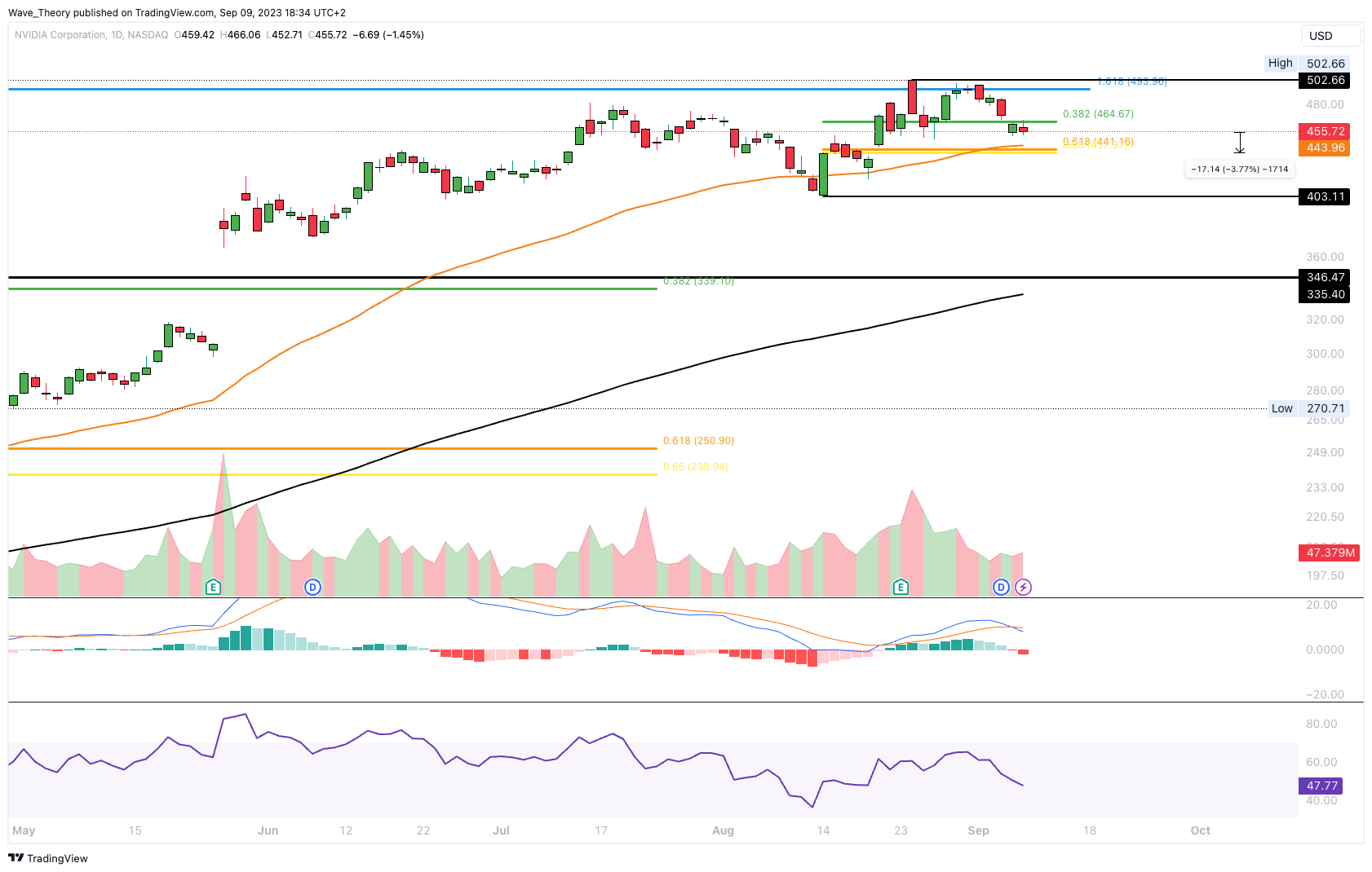 Der Nvidia Kurs erreichte den Fib Widerstand an der 500 USD Marke, um dort ein Allzeithoch zu etablieren. Anschließend formte der NVDA Kurs aber einen tieferen Hochpunkt und initiierte eine starke Korrekturbewegung. Dabei hat der NVDA Kurs bereits die 0,382 Fib Unterstützung bei rund 465 USD bärisch gebrochen. Damit könnte der Kurs jetzt zum 50-Tage-EMA an der Golden Ratio Unterstützung bei rund 440 USD korrigieren. Das impliziert ein Abwärtspotenzial von rund 3,8 %.