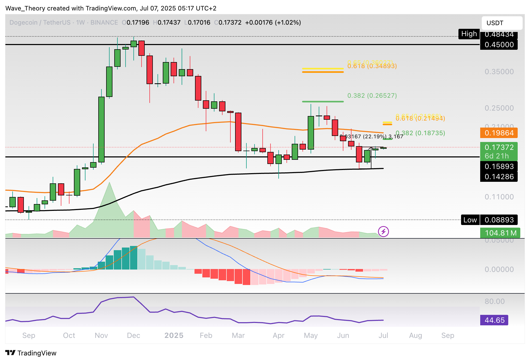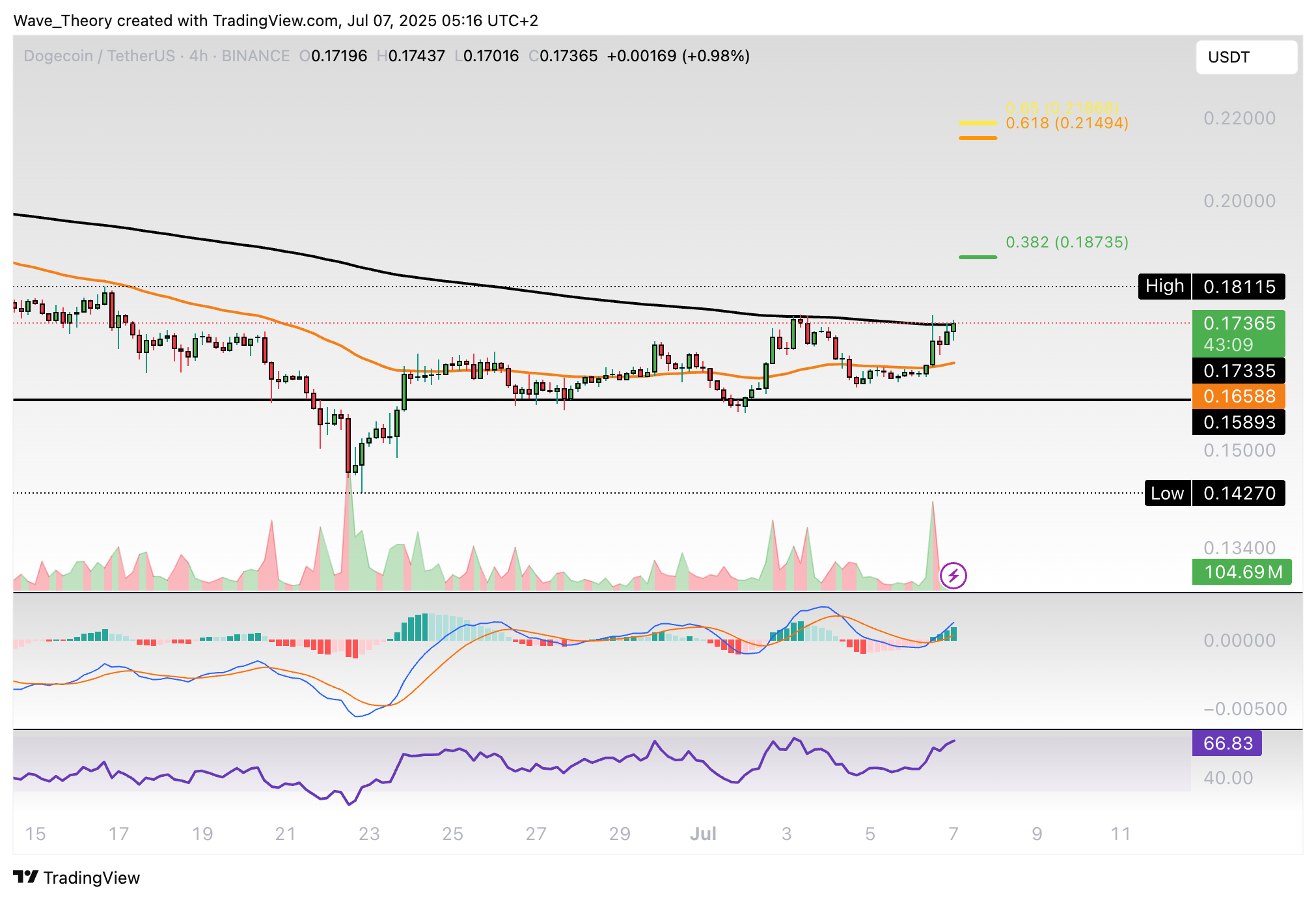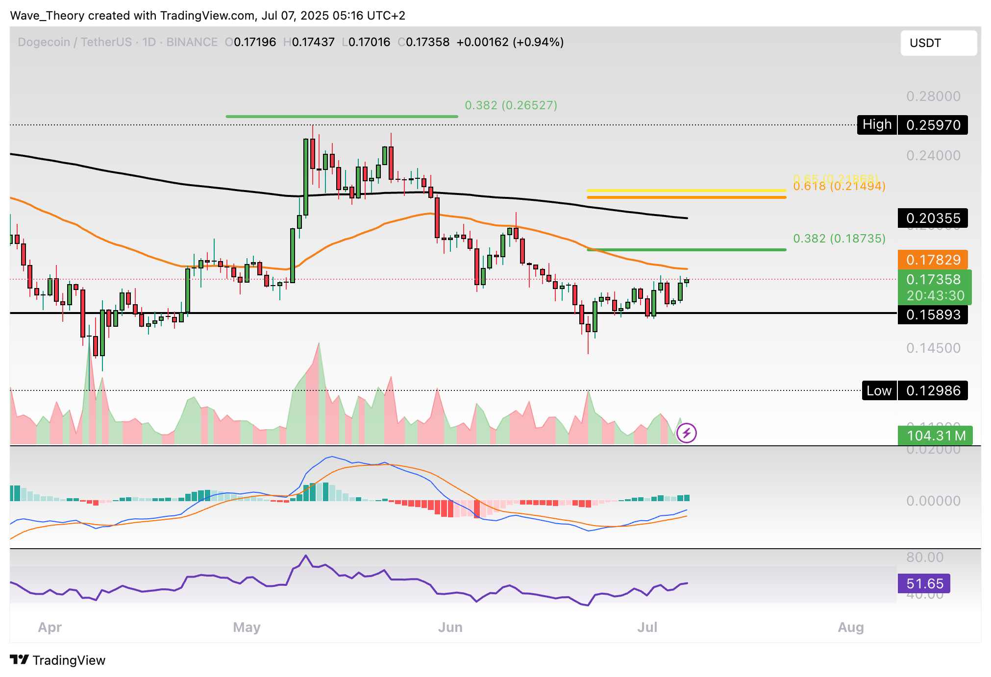 Dogecoin-Prognose für Dienstag, 08. Juli 2025: Der Dogecoin Kurs konnte an der Unterstützung abprallen und nimmt jetzt den 0,382 Fib Widerstand ins Visier.