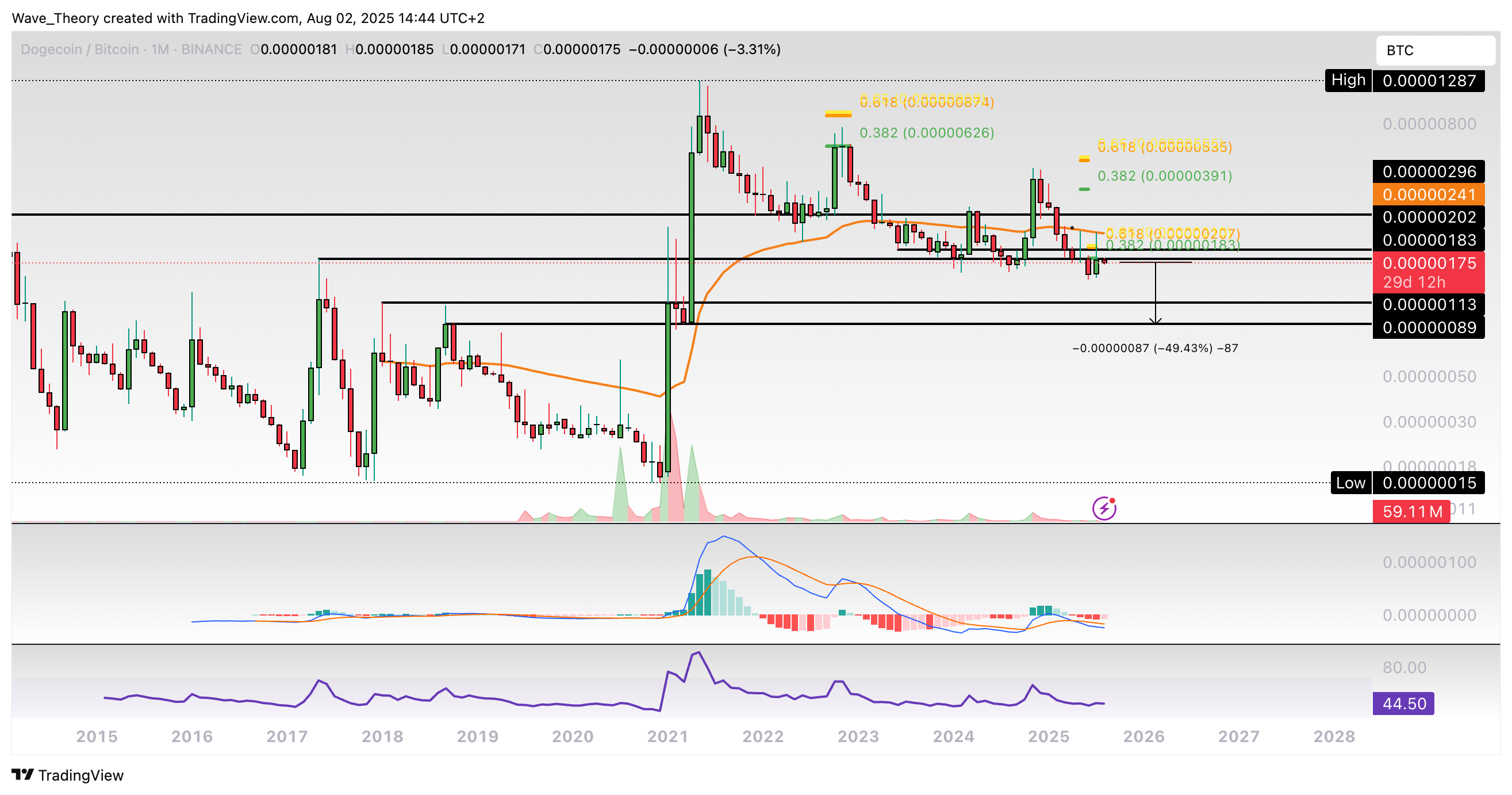 Gegen Bitcoin wurde Dogecoin letzten Monat am 50-Monate-EMA bei rund 0,0000024 BTC bärisch abgewiesen. Seither geht es wieder bergab.