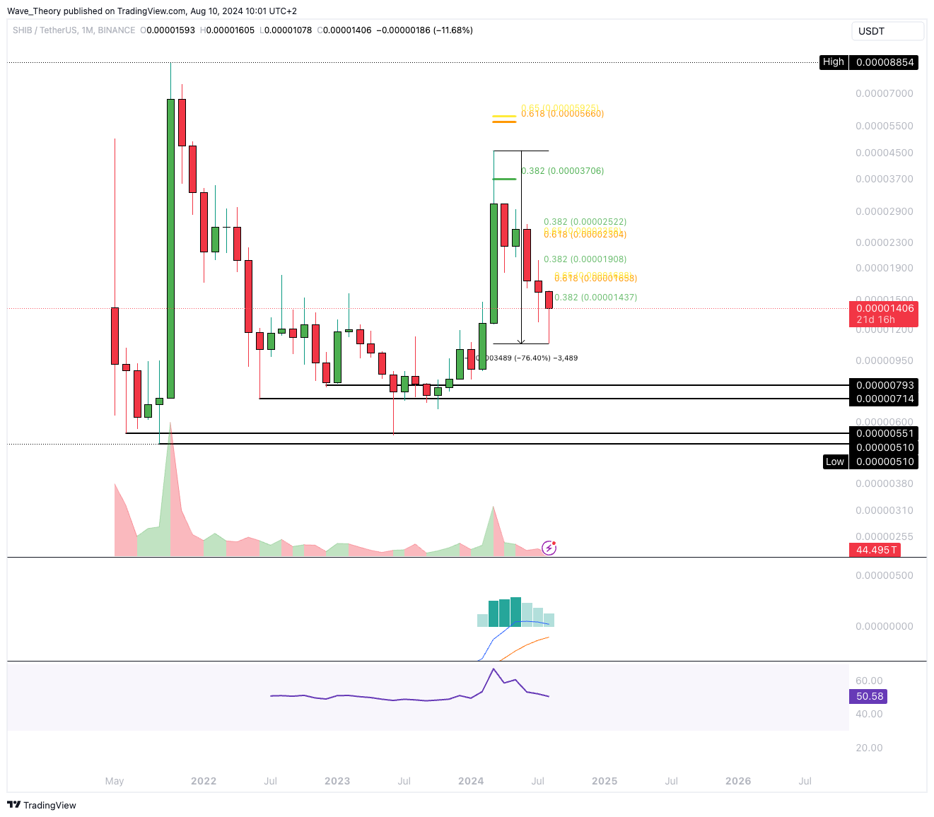 Insgesamt ist der Shiba Inu Kurs seit März über 76 % gefallen. Sollte Shiba Inu die Abwärtsbewegung mittelfristig fortsetzen, wartet zwischen rund 0,00000714 USD und 0,00000793 USD signifikante Unterstützung.