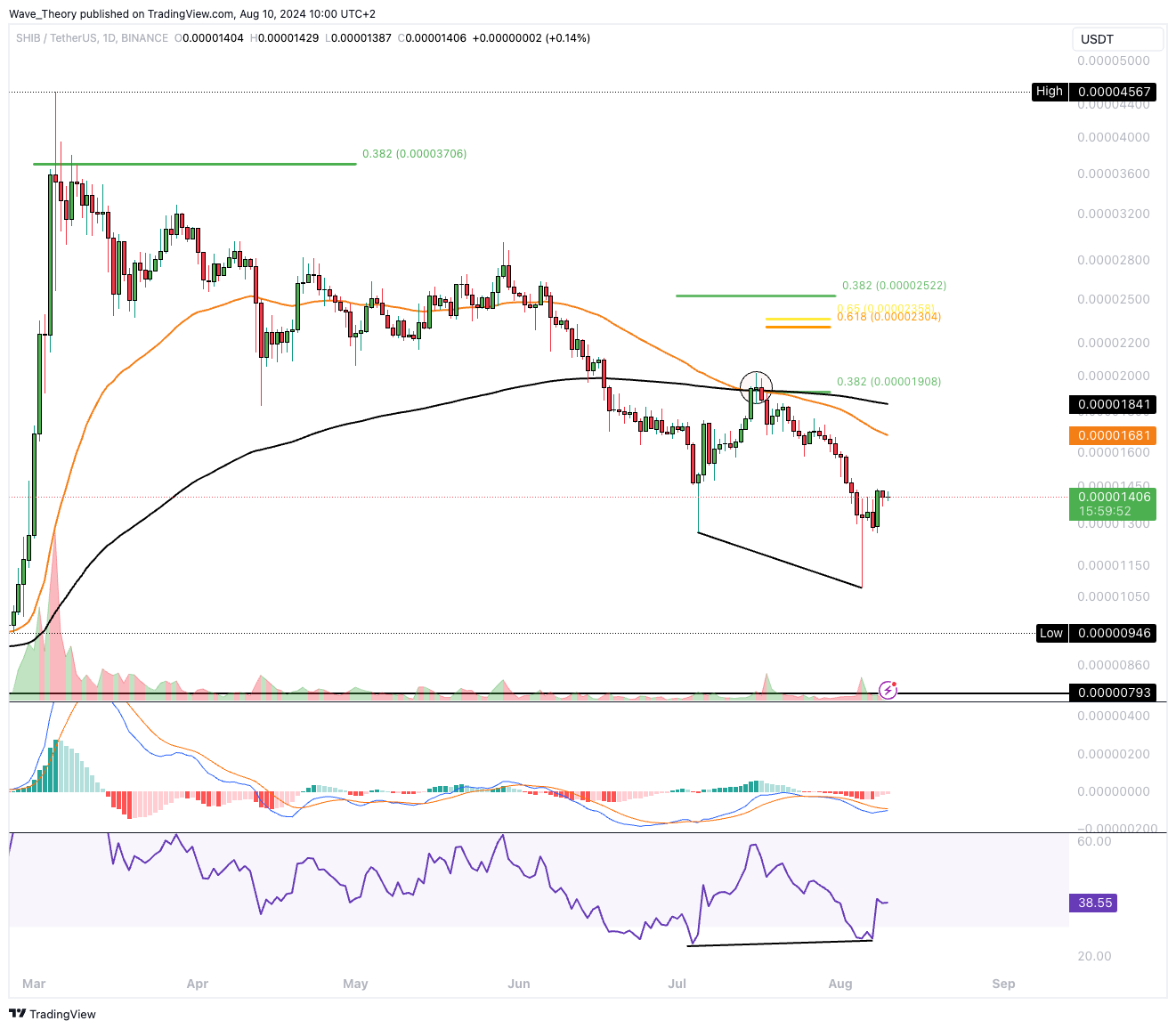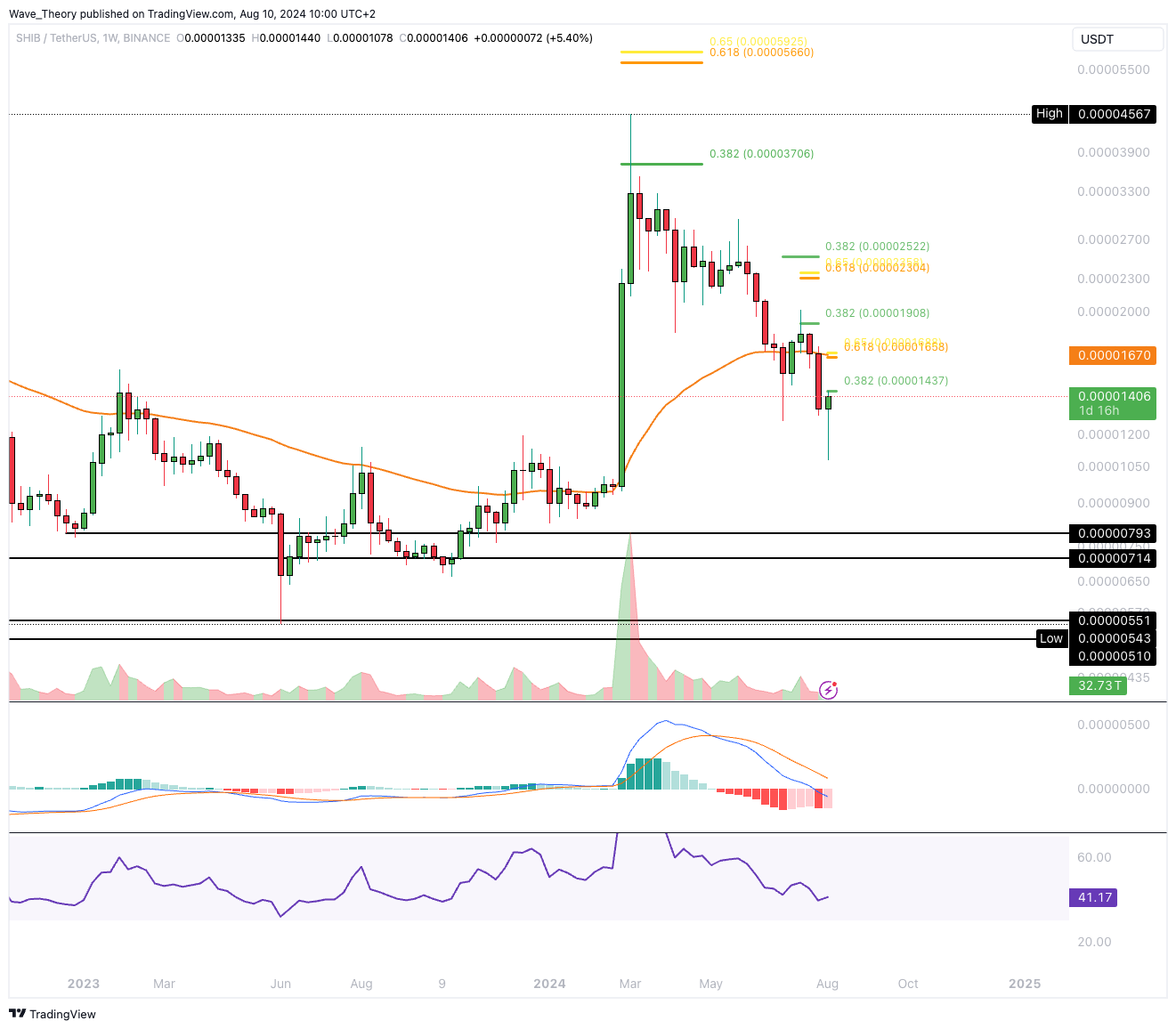 Der SHIB Kurs stößt jetzt am 0,382 Fib Widerstand bei rund 0,0000144 USD auf signifikanten Fib Widerstand. Mit einem bullischen Bruch wartet an der Golden Ratio bei rund 0,0000166 USD der entscheidende Fib Widerstand.