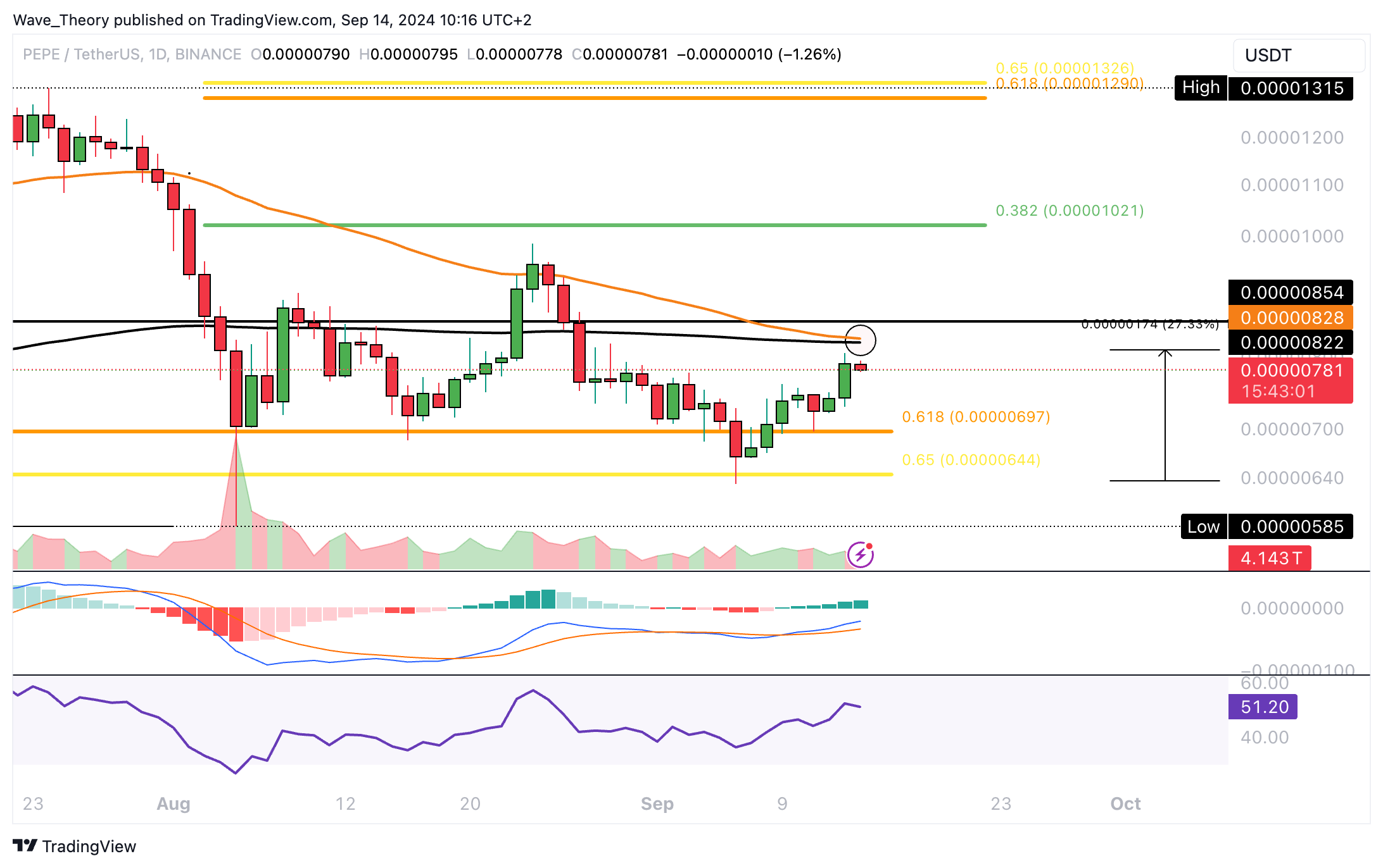 Dementsprechend stößt Pepe bei rund 0,0000065 USD auf starke Unterstützung. Pepe könnte die Aufwärtsbewegung jetzt fortsetzen, um den Fib Widerstand bei rund 0,0000102 USD anzuvisieren.