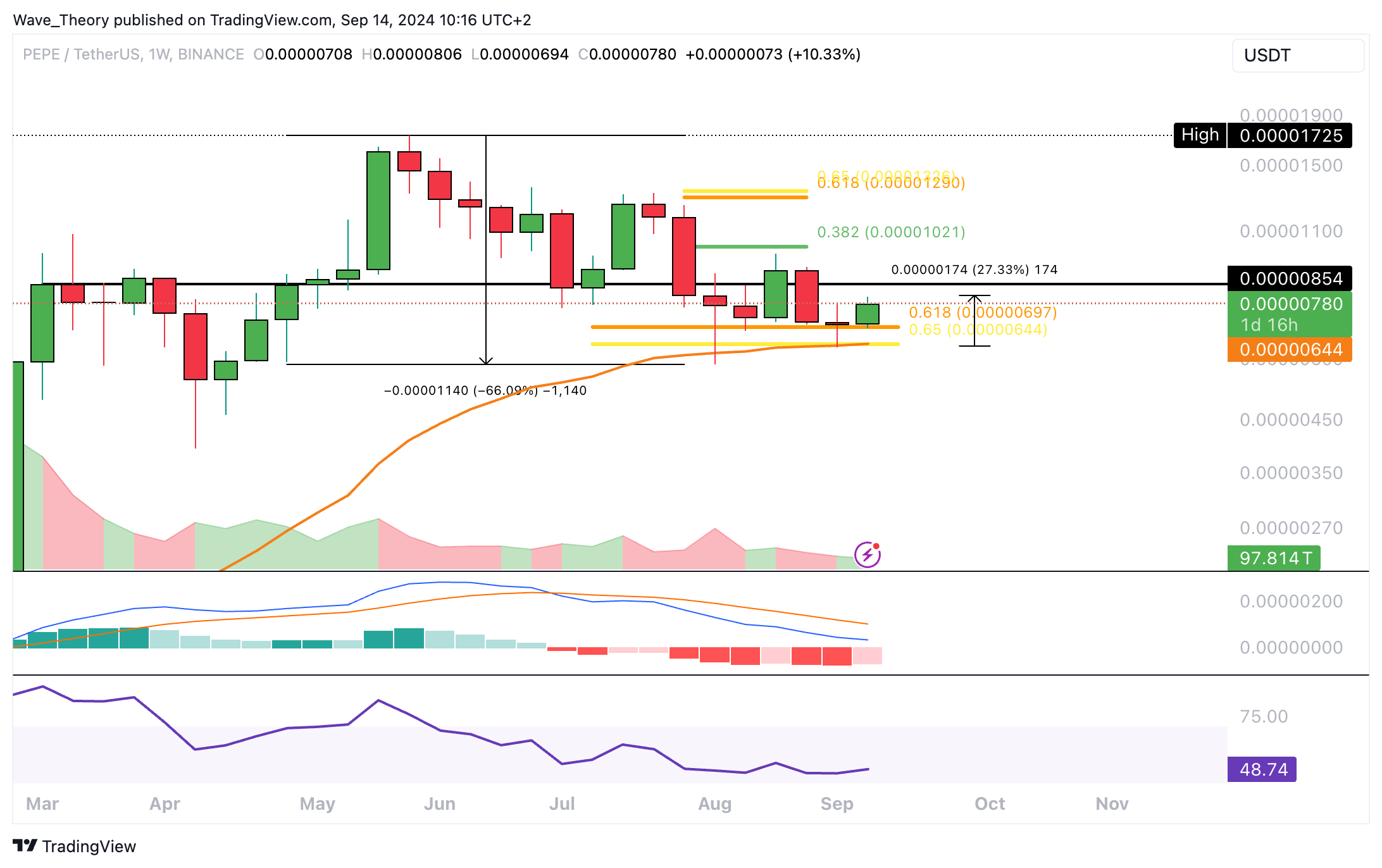 In den letzten vier Monaten ist der Preis von Pepe über 66 % gefallen. Doch bisher konnte sich Pepe über der Golden Ratio Unterstützung bei rund 0,000007 USD halten.