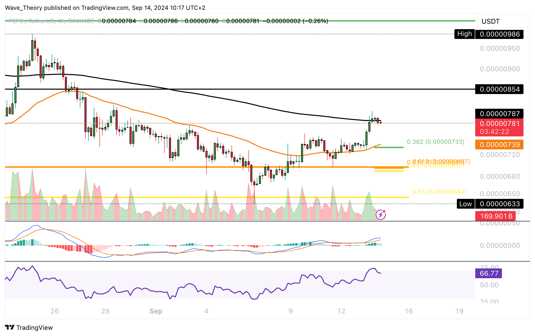 Sollte PEPE jetzt korrigieren, warten bereits bei rund 0,00000733 USD und 0,0000065 USD die nächsten signifikanten Fibonacci Unterstützungen. Bei rund 0,0000074 USD fungiert der 50-4H-EMA als zusätzliche Unterstützung.