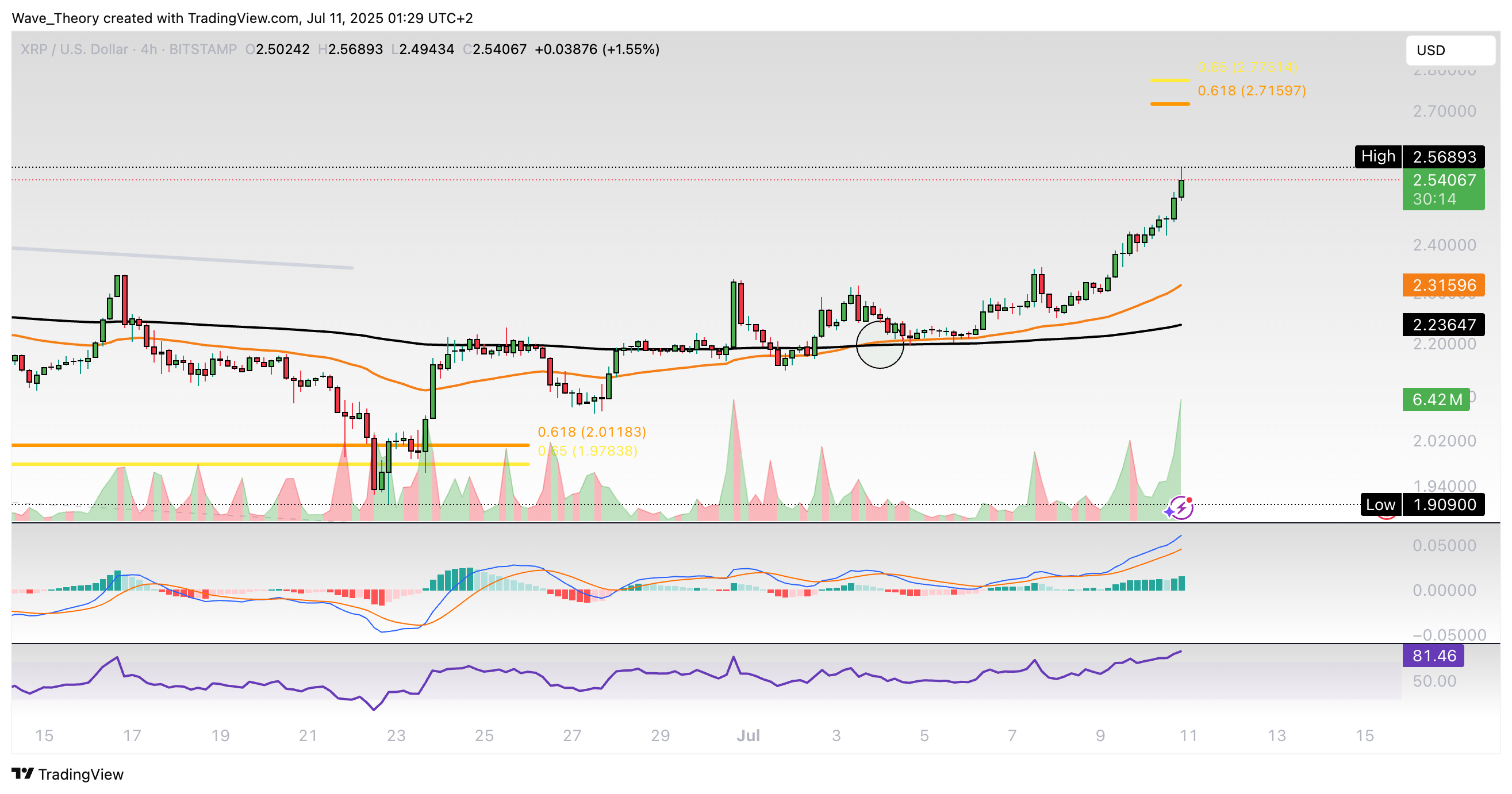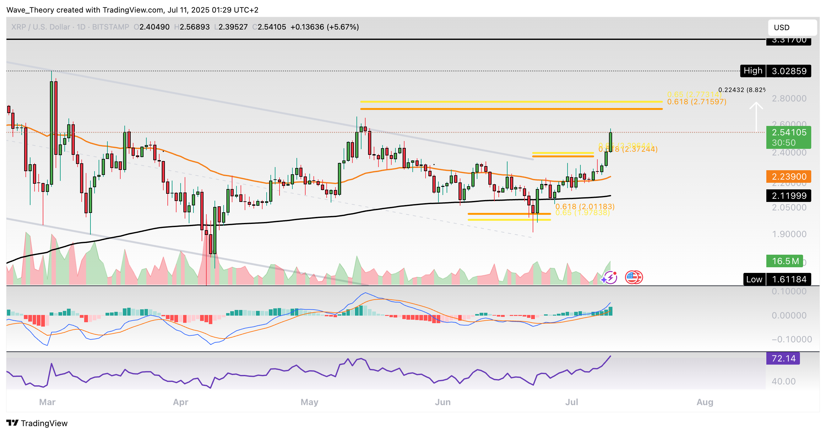Ripple-Prognose für Freitag, 11. Juli 2025: Der XRP Kurs konnte wichtigen Golden Ratio Widerstand bei rund 2,4 USD überwinden.