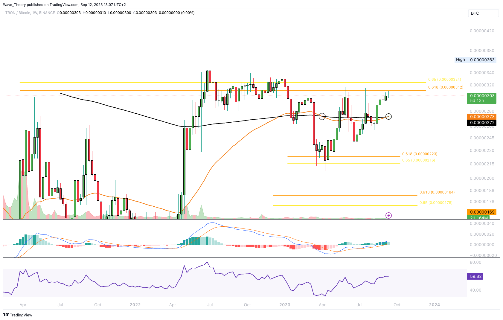 Gegen BTC kämpft der TRX Kurs seit Monaten mit dem Golden Ratio Widerstand bei rund 0,0000032 BTC. Vor einigen Wochen konnte TRON an der Golden Ratio Unterstützung bei rund 0,0000022 BTC abprallen. Jetzt kämpft TRX erneut mit dem Golden Ratio Widerstand bei rund 0,0000032 BTC. Darüber hinaus beginnt das Histogramm des MACDs in dieser Woche bärisch tiefer zu ticken, obschon es die letzten Wochen einen bullischen Trend aufwies.