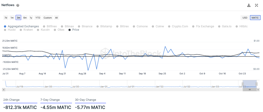 So wurden in den letzten 24 Stunden rund 812.000 mehr MATIC Token abgehoben als auf Börsen eingezahlt. In den letzten sieben Tagen liegt sogar ein Abhebungsüberschuss von rund 4,55 Millionen Token vor.