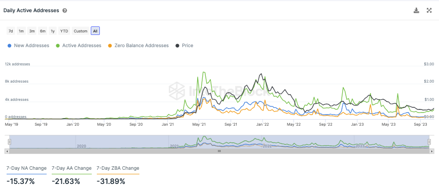 Die Anzahl an aktiven Adressen ist in den letzten sieben Tagen um rund 21,6 % zurückgegangen. Die Anzahl an neuen MATIC Adressen ist sogar um mehr als 15 % gefallen und auch die Anzahl an MATIC Adressen ohne Guthaben hat einen Rückgang von rund 31,9 % verzeichnet.