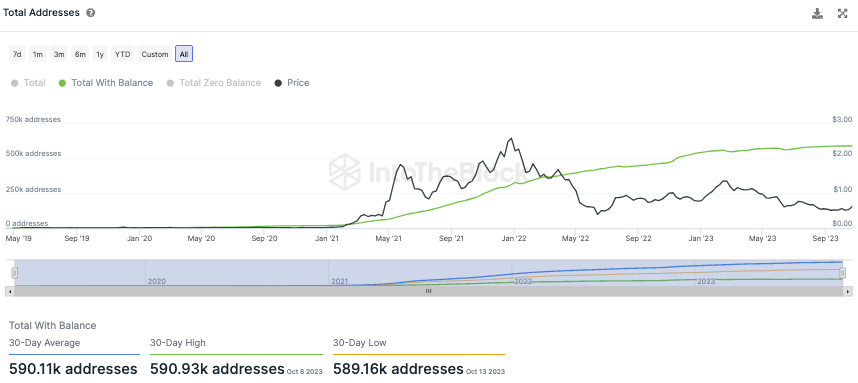 Die Anzahl an Adressen mit MATIC Guthaben befindet sich weiterhin im Aufwärtstrend. In den letzten 30 Tagen wurden durchschnittlich rund 590.000 Adressen gezählt. Jedoch ist die Wachstumskurve deutlich abgeflacht. Tatsächlich nähert sich Polygon einer Stagnationsphase.