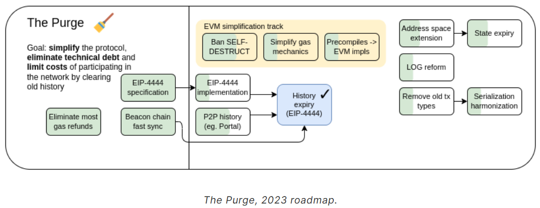 Buterins Purge-Upgrade führt ein Konzept ein, das die wachsenden Speicheranforderungen von Ethereum adressiert. Indem es veraltete Netzwerkgeschichten löscht, soll es Engpässe beseitigen und den benötigten Festplattenspeicher zum Betreiben eines Knotens reduzieren.