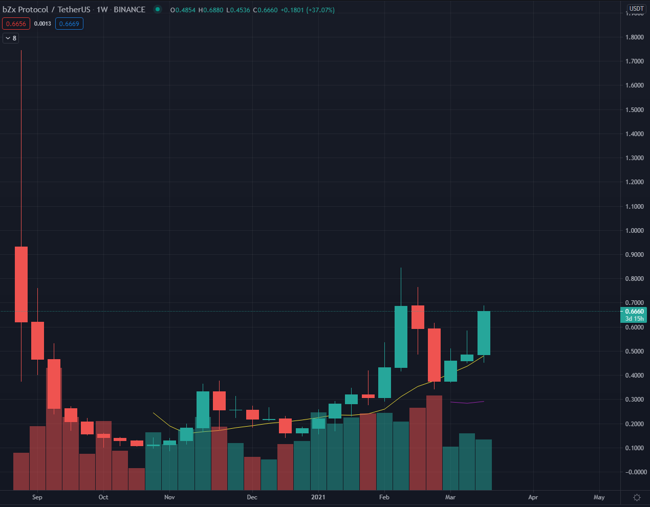 In dieser Woche ist der Preis etwas mehr als 15% gestiegen, vermutlich auch wegen der Ankündigung des neuen Yield-Farming-Programms. Es befinden sich insgesamt eine Milliarde BZRX im Umlauf. Der Preis des Tokens erreichte im August 2020 ein Allzeithoch bei rund 1,70 US-Dollar und ist jetzt immer noch weit von diesem Preis entfernt.