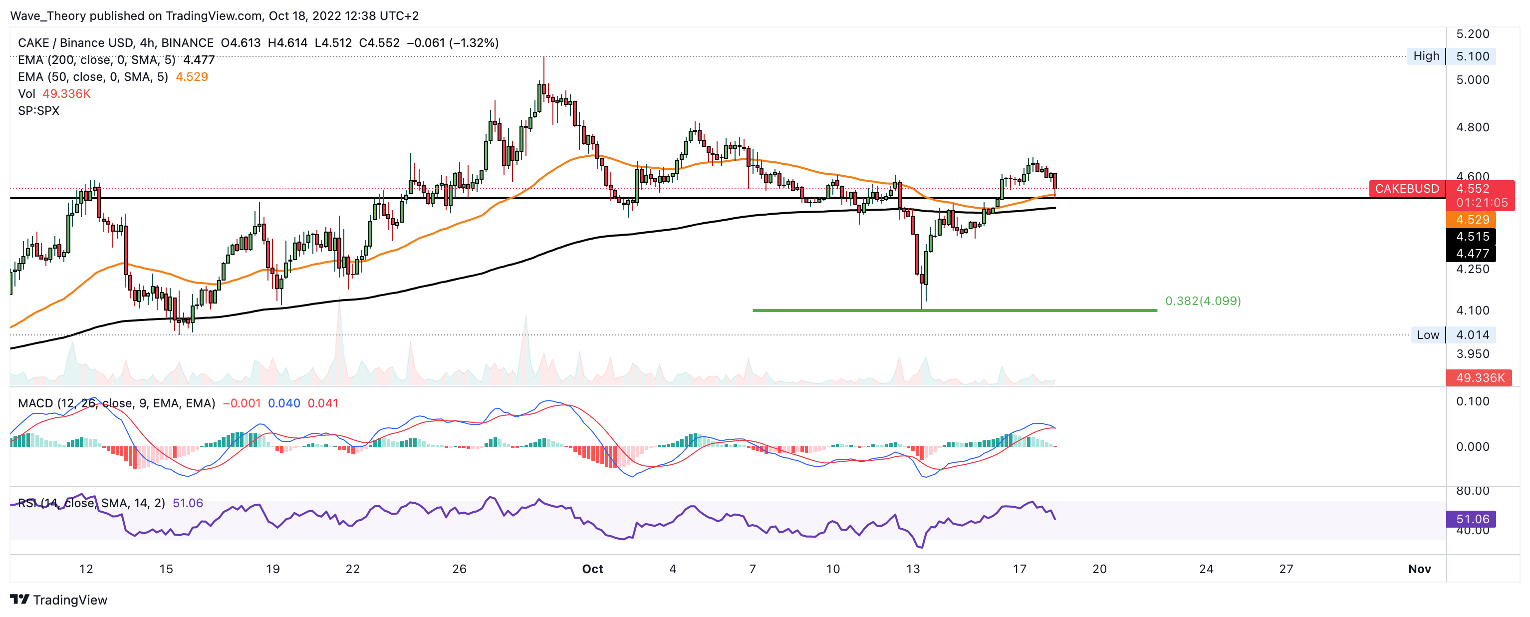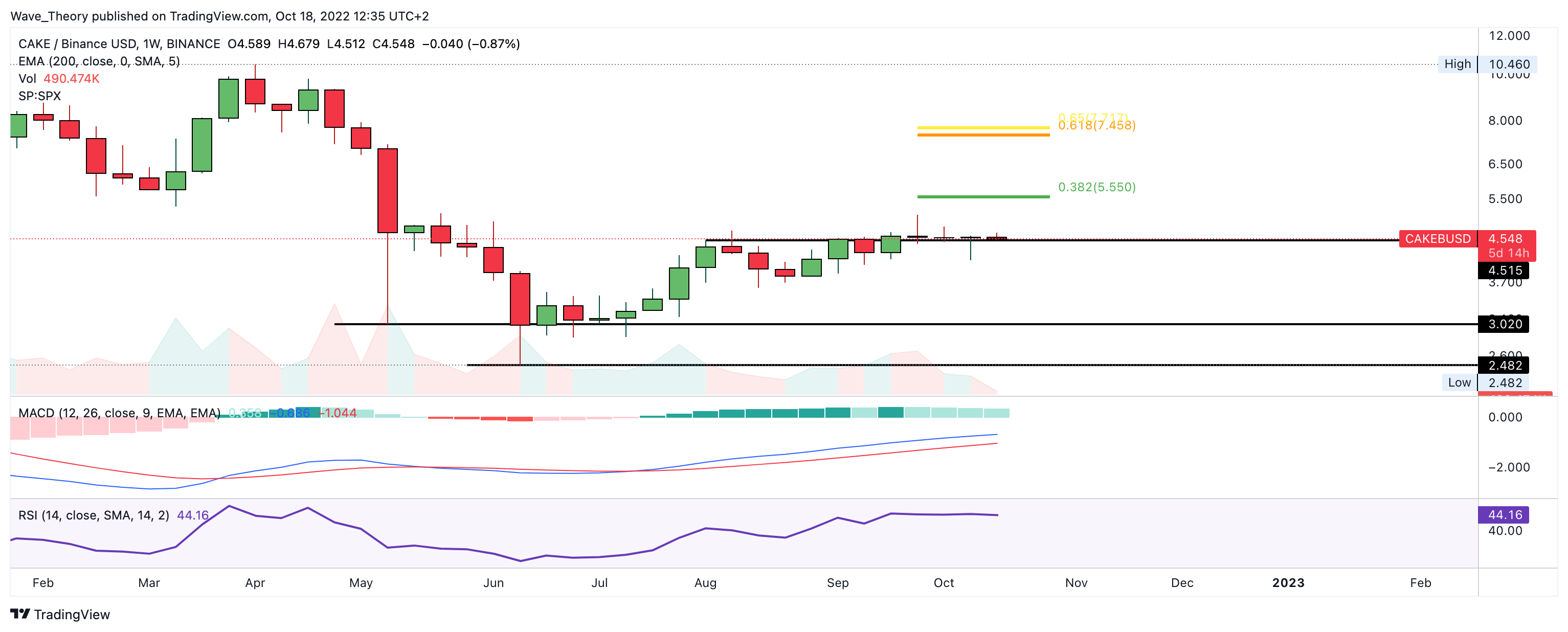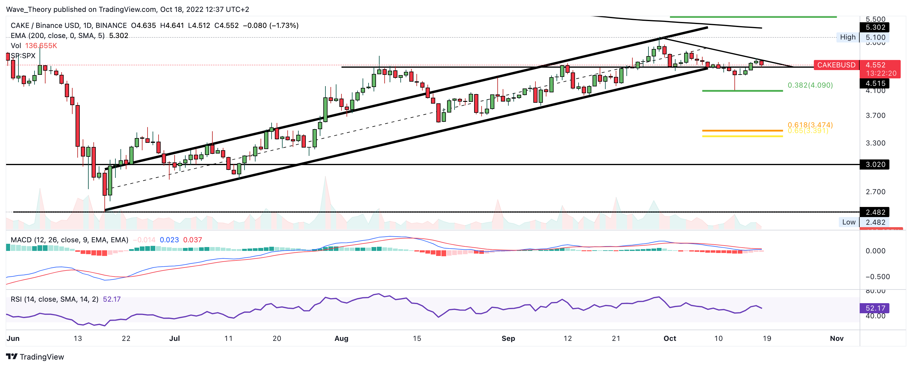 In der letzten CAKE Kurs Prognose, welche bereits drei Wochen her ist, schrieben wir: “Tatsächlich verliefen die folgenden Wochen nach der letzten CAKE Kurs Prognose sehr bullisch. Der CAKE Kurs befindet sich seit ein paar Tagen in einem aufsteigendem Dreieck. Aktuell unternimmt CAKE den dritten Versuch, den horizontalen Widerstand zwischen 4,58 USD und 4,73 USD zu brechen. Bei einem bullischen Bruch könnte CAKE bis zum 0,382 Fib Widerstand am 200-Tage-EMA bei rund 5,5 USD steigen.