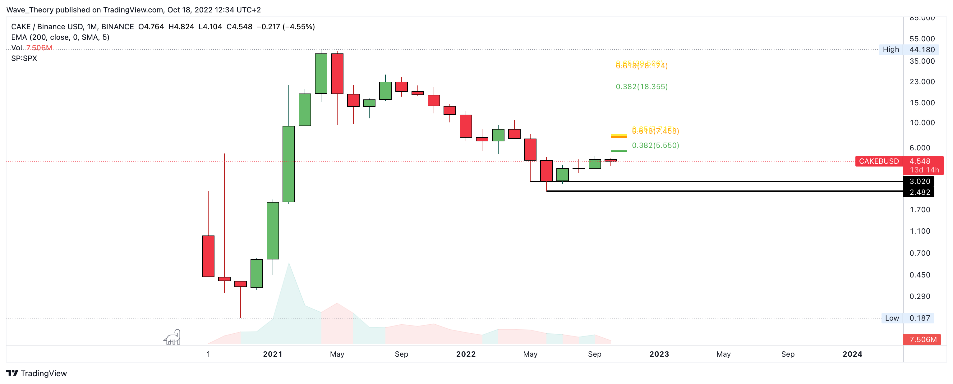 Sollte CAKE diese Unterstützung brechen, wartet bei rund 3,5 USD die nächste signifikante Fibonacci Unterstützung. Ansonsten findet CAKE spätestens zwischen 2,482 USD und 3 USD signifikante Unterstützung.