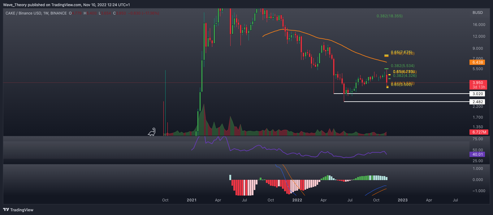 Sollte CAKE diese Unterstützung brechen, wartet bei rund 3,5 USD die nächste signifikante Fibonacci Unterstützung. Ansonsten findet CAKE spätestens zwischen 2,482 USD und 3 USD signifikante Unterstützung.”