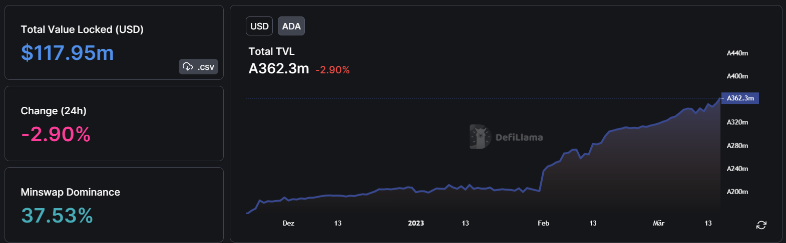 In Dollarwert entspricht der Cardano TVL 117,95 Millionen US-Dollar. Dabei machen die DeFi-Anwendungen Minswap DEX und Indigo über 50 % des TVL aus, wie die Daten zeigen. In diesem Artikel setzt sich BeInCrypto intensiv mit der überragenden Entwicklung von Cardano (ADA) auseinander. Der Frage, ob die positive Entwicklung auch mit dem im Januar gelaunchten Cardano-Stablecoin “Djed” zusammenhängen kann, gehen wir hier detailliert nach.
