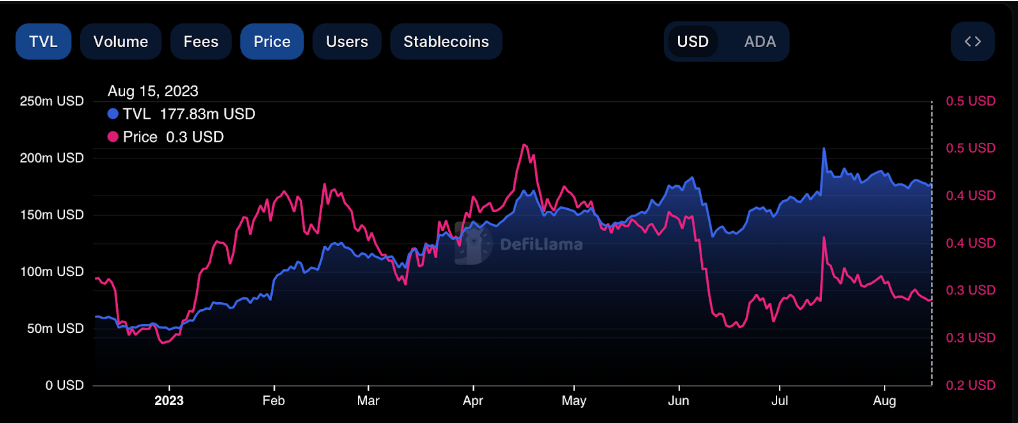 Da der Preis derzeit bei 0,29 US-Dollar liegt, ist ADA seit seinem am 17. April verzeichneten Höchststand im Jahr 2023 um 36 % gesunken. Unterdessen hat das Cardano DeFi-Ökosystem ein ganz anderes Schicksal erlebt.