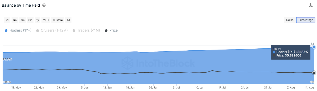 Kennzahlen wie IntoTheBlocks “Balances By Time Held”-Daten illustrieren die Tendenz eines anhaltenden Optimismus bei langfristigen Cardano-Investor:innen.