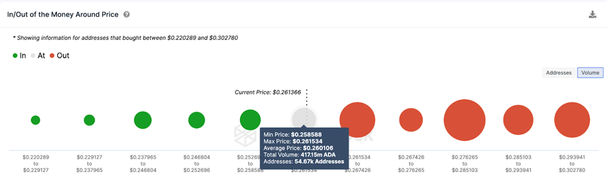 Sponsored SponsoredDie In/Out of Money Around Price Daten (IOMAP), die die Kaufpreisverteilung der aktuellen Cardano-Inhaber:innen darstellen, unterstützen diese Prognose ebenfalls. Sie zeigen, dass 52.260 Investierende 347 Millionen ADA-Coins zum Durchschnittspreis von 0,25 US-Dollar kauften. Diese Investierenden bieten eine beträchtliche Unterstützung, vor allem wenn die Langzeitinvestoren wie vorhergesagt weiterhin ihre Coins nicht verkaufen.