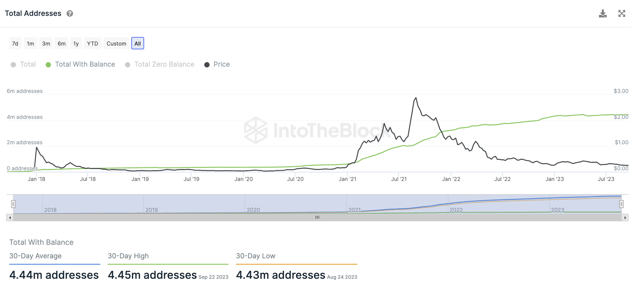 Die Gesamtanzahl an ADA Adressen im Cardano Netzwerk erlebt trotzdem einen Aufwärtstrend. In den letzten 30 Tagen wurden durchschnittlich rund 4,44 Millionen Adressen mit ADA Guthaben gezählt.