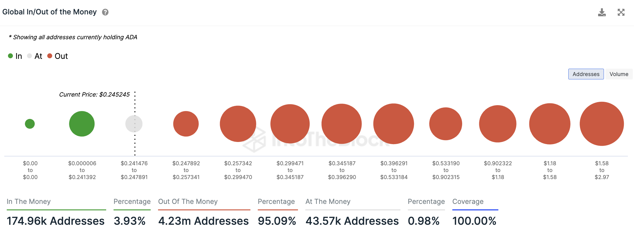 Laut IntoTheBlock, einem sehr nützlichen Krypto-Tool, sind über 95 % der Cardano Adressen im Minus. Weniger als 4 % könnten ihre ADA Token zum aktuellen Kurs mit Gewinn verkaufen, wohingegen knapp 1 % ohne Gewinn oder Verlust aus dem Verkauf gehen würden.