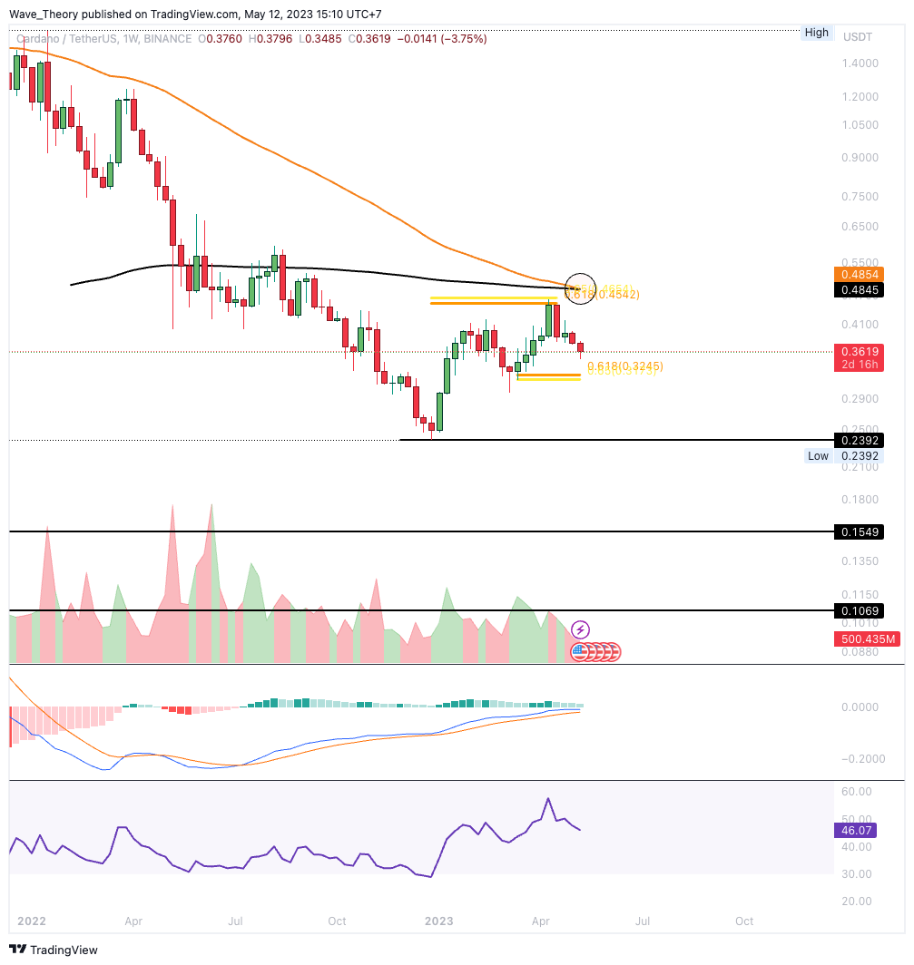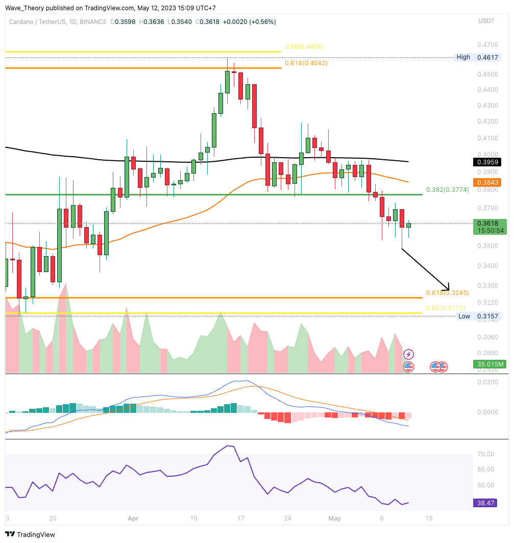 Vor einigen Wochen wurde Cardano am Golden Ratio Widerstand bei rund 0,465 USD bärisch abgewiesen, womit der Bärentrend nicht gebrochen werden konnte. Anschließend kehrte ADA zur 0,382 Fib Unterstützung bei rund 0,3774 USD zurück. Diese Unterstützung hat Cardano jetzt bärisch durchbrochen.