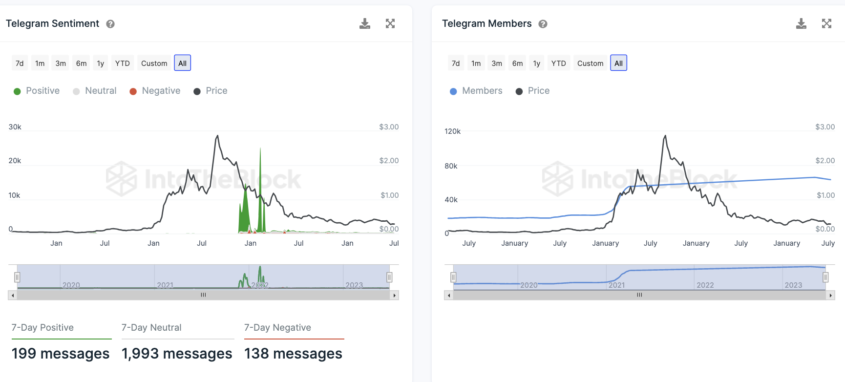 Statt einem überwiegend positiven Sentiment auf Telegram, nehmen derzeit die negativen Nachrichten zu. So stehen in den letzten sieben Tage 199 positive Tagen 138 negativen Nachrichten gegenüber. Auch die Anzahl an Telegram Nutzern bzw. Mitgliedern der Cardano Gruppe verzeichnet seit wenigen Wochen einen Abwärtstrend.