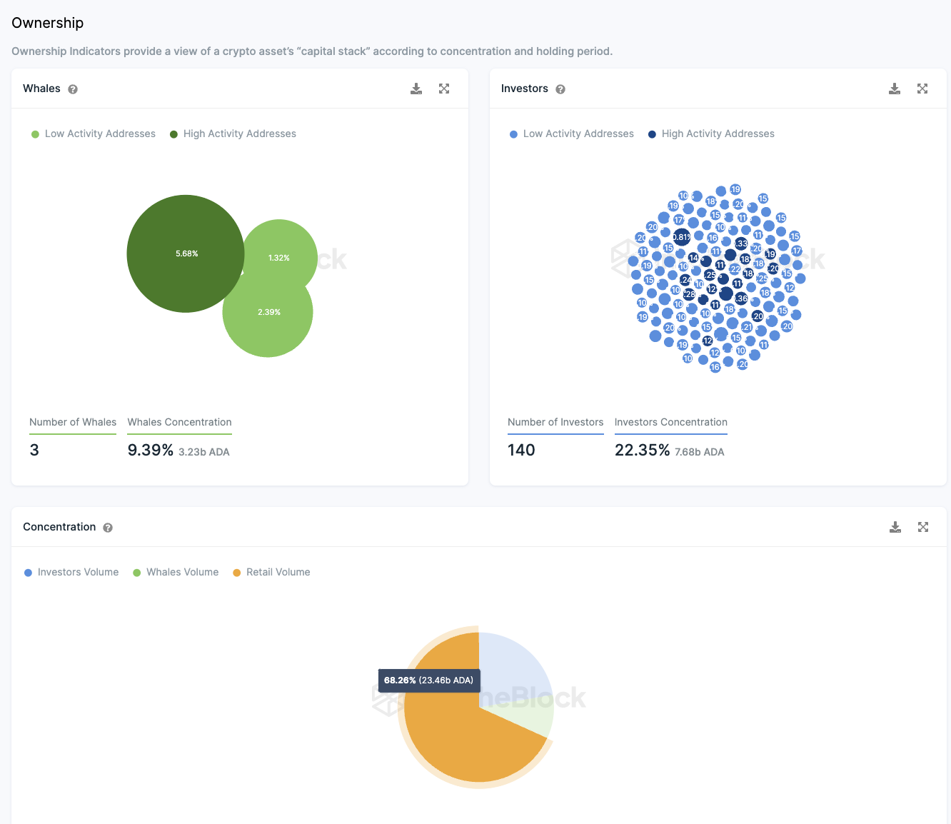 Auch die Anzahl an Großinvestoren nimmt weiter ab, denn diese ist seit der letzten Analyse um zwei Adressen zurückgegangen. Derzeit liegen rund 22,35 % der ADA Supply in den Händen von 140 Großinvestoren Adressen. 9,4 % liegen dabei in den Adressen von drei Walen, wohingegen der überwiegende Teil, rund 68 %, unter Kleinanlegern verteilt ist.