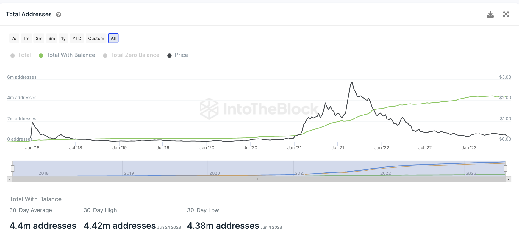Die Gesamtzahl der Cardano Adressen weist jedoch noch immer ein Aufwärtstrend auf. In den letzten 30 Tagen lag der Durchschnitt von der Anzahl an Cardano Adressen mit ADA Guthaben bei rund 4,4 Millionen.
