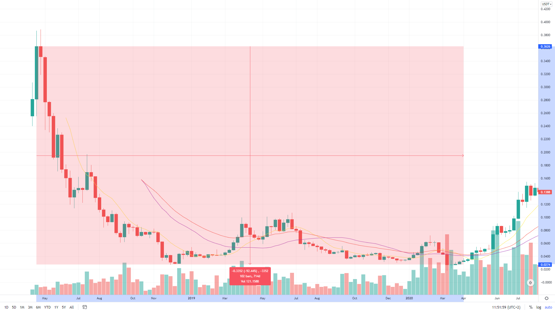 Sollte der ADA Kurs tatsächlich das letzte Preisziel unseres Traders erreichen, dann wäre der ADA Preis 88% von dem letzten Allzeithoch (3.10 USD) entfernt. In diesem Fall hätten wir also einen ähnlichen Kursrückgang wie 2018.