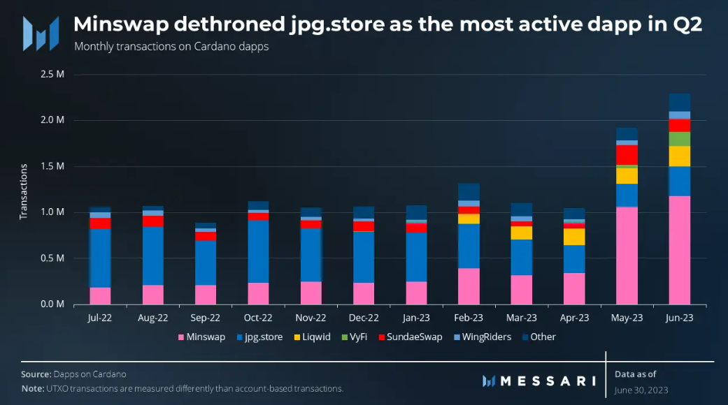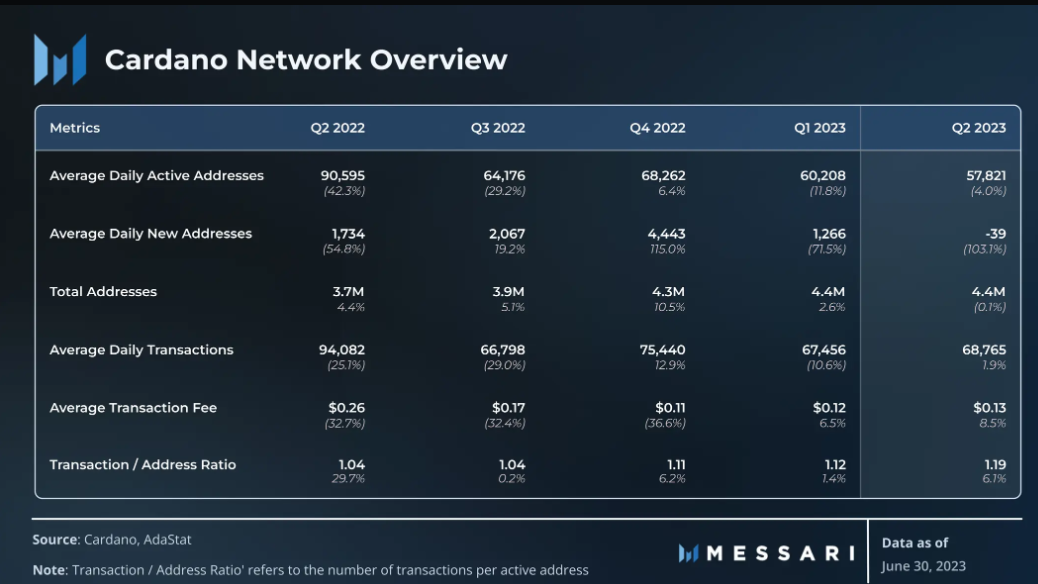 Laut eines Berichts des Analyseunternehmens Messari stieg die Aktivität auf der Cardano-Blockchain im zweiten Quartal 2023 dank technischer Verbesserungen und gesteigerten Entwicklerinteresses um sagenhafte 49 %. Dies betraf sowohl den Total Value Locked (TVL) als auch Transaktionskennzahlen im Vergleich zum ersten Quartal.