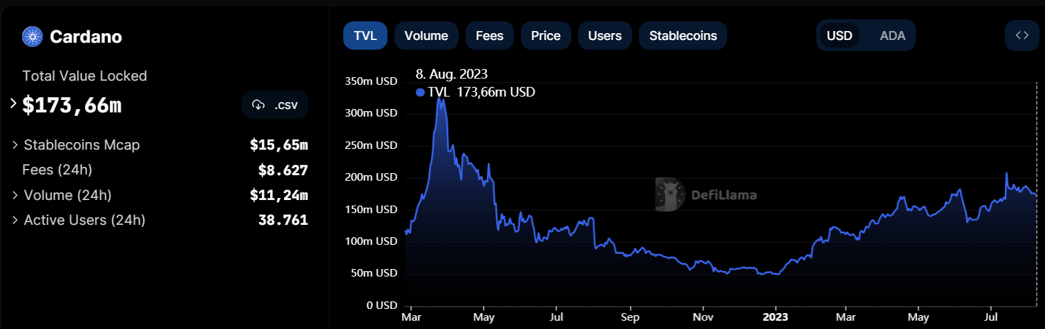 Laut DefiLlama-Daten waren am Montag Token im Wert von knapp 174 Millionen US-Dollar auf Cardano gesperrt, was den Höchststand dieses Jahres – knapp 210 Millionen US-Dollar – knapp unterbietet. Dennoch liegt dieser Wert etwa 50 % unter dem Allzeithoch von 340 Millionen US-Dollar im Mai 2022.