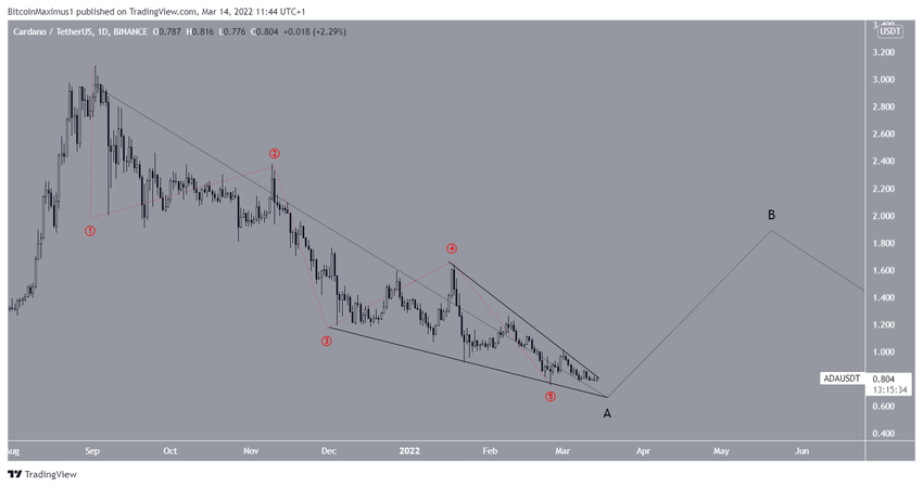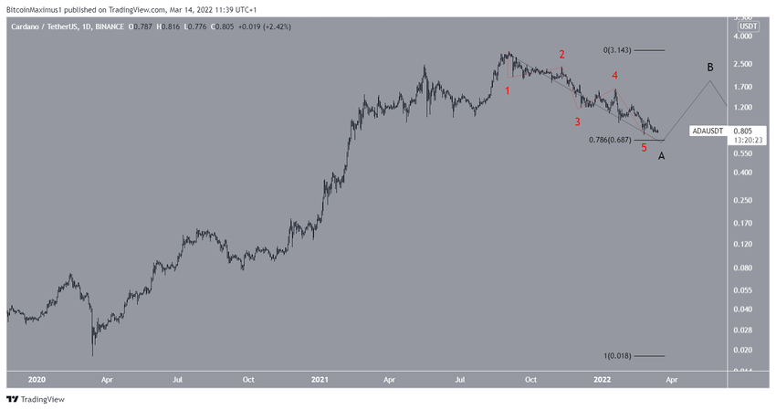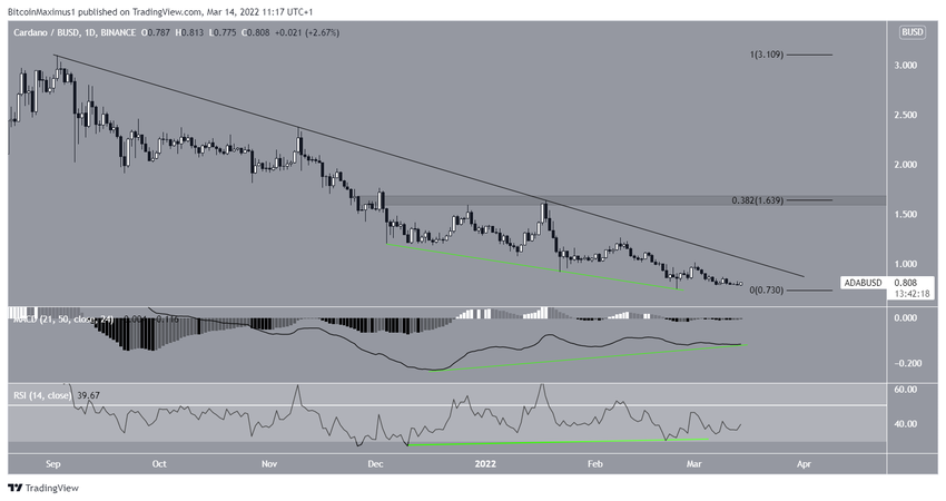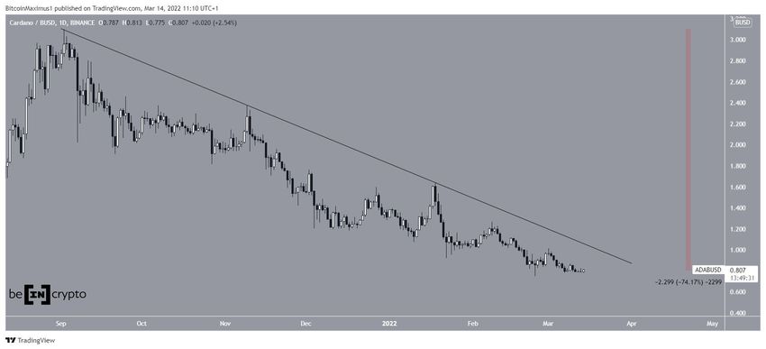 Der Cardano Kurs ist, seitdem er am 2. September 2021 das letzte Allzeithoch bei 3.10 USD erreicht hat, kontinuierlich gefallen und folgte einer absteigenden Widerstandslinie. Am 24. Februar 2022 erreichte der ADA Kurs dann den letzten Tiefpunkt bei 0.745 USD. Die entsprechende Tageskerze hat eine lange, untere Wick (ein Zeichen für starken Kaufdruck). Allerdings gab es danach noch keine signifikante Aufwärtsbewegung. Der Tiefpunkt ist zudem rund 74% von dem letzten Allzeithoch entfernt. Könnte der ADA Kurs also bald den Bottom erreicht haben?