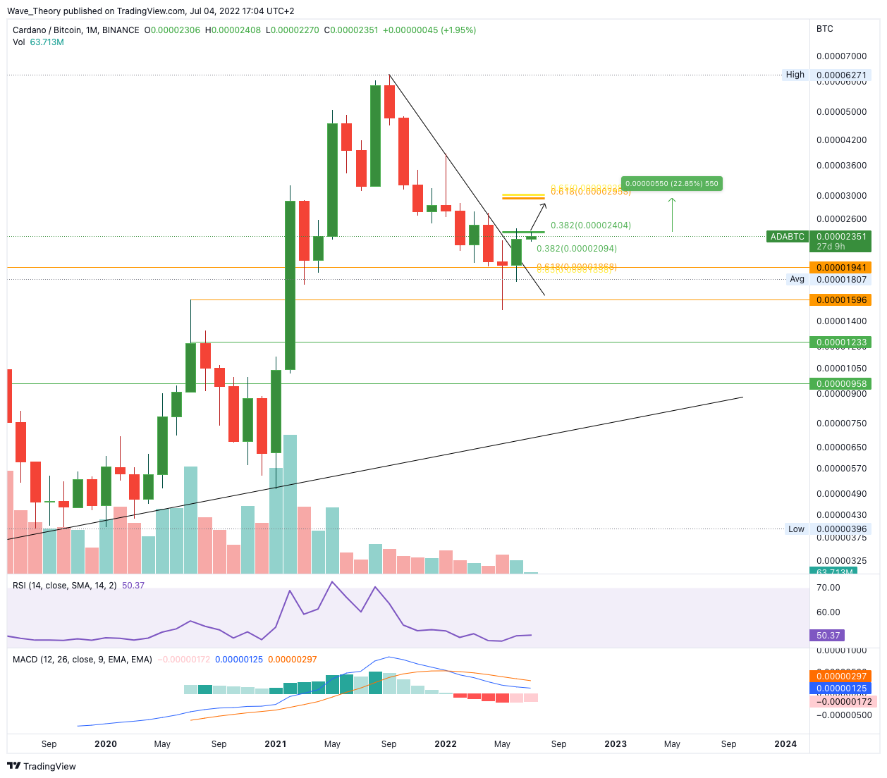 Gegen BTC tickt das Histogramm des MACDs im Monatschart bereits seit letzten Monat bullisch höher, während die MACD Linien noch bärisch überkreuzt bleiben. Aktuell kämpft der Cardano Kurs mit dem 0,382 Fib Widerstand bei rund 0,000024 BTC und sollte Cardano dieses Fib Niveau bullisch brechen, könnte Cardano rund 23 % steigen, um das nächste Fibonacci Niveau bei rund 0,00003 BTC zu erreichen.