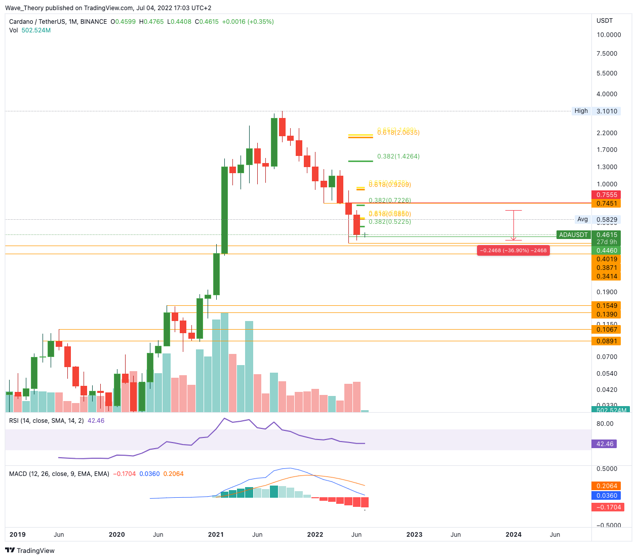 Trotz des bärischen Monatscharts hat Cardano dennoch die Chance, bei rund 0,4 USD einen Boden in diesem Zyklus zu finden. Schließlich konnte Cardano die letzten zwei Monate über der 0,45 USD Marke schließen, obwohl Cardano bereits vorletzten Monat rund 0,4 USD erreicht hatte.