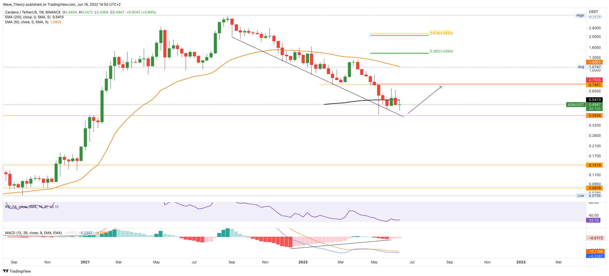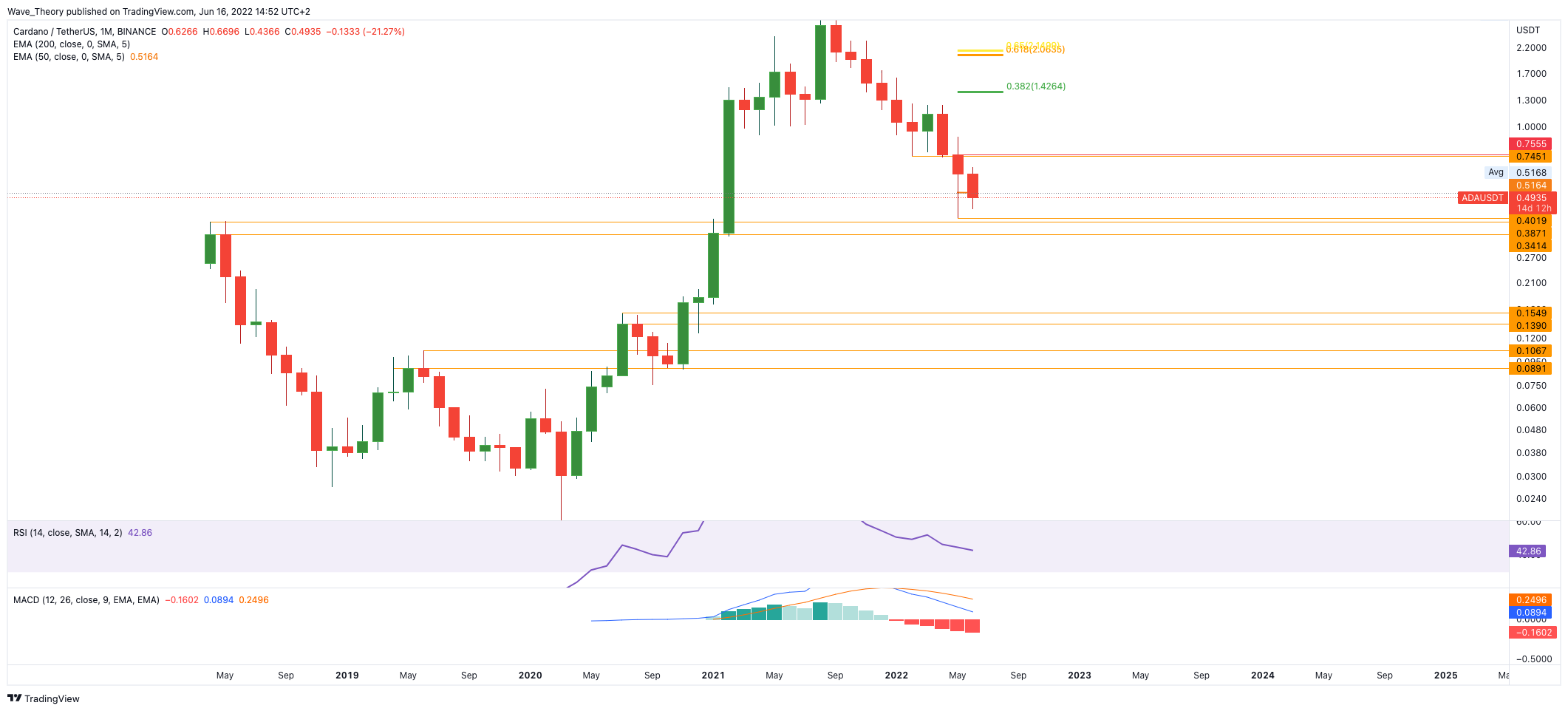 Die MACD Linien sind im Monatschart jedoch noch bärisch überkreuzt, jedoch tickt das Histogramm in diesem Monat bullisch höher. Nach unten hin wartet bereits zwischen 0,000016 – 0,0000194 BTC signifikante Unterstützung auf den ADA Kurs. Bis jetzt konnte der 50-Monate-EMA bei rund 0,0000194 BTC erfolgreich halten, was ebenfalls ein bullisches Zeichen ist.
