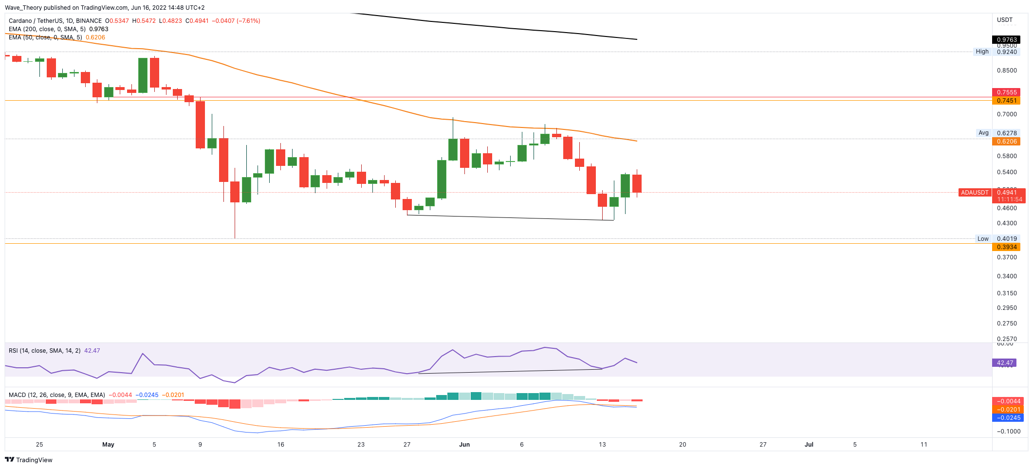 Trotz der Tatsache, dass Ethereum, Bitcoin und die Gesamtmarktkapitalisierung des Kryptomarktes eine Etage tiefer gefallen ist, bleibt der Cardano Kurs noch immer über der letzten Unterstützung bei rund 0,4 USD. Tatsächlich weist der Tageschart sogar eine leichte bullische Divergenz im RSI auf.